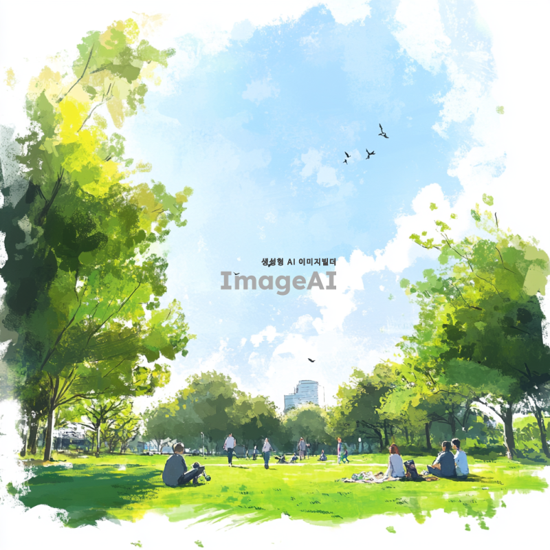 햇살이 밝게 내리쬐는 푸른 하늘 아래, 초록빛 가득한 공원에서 사람들이 여유롭게 산책을 즐기고 있는 모습. 나무 그늘 아래에서 책을 읽거나, 잔디밭에 앉아 피크닉을 즐기는 가족들, 그리고 하늘을 나는 새들이 평화롭고 활기찬 분위기를 더하고 있는 장면.