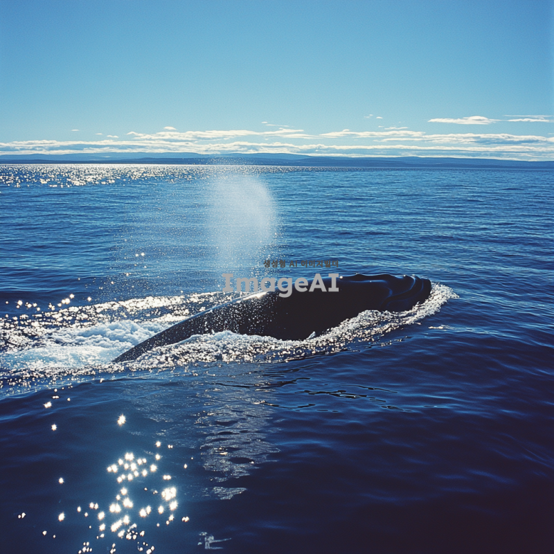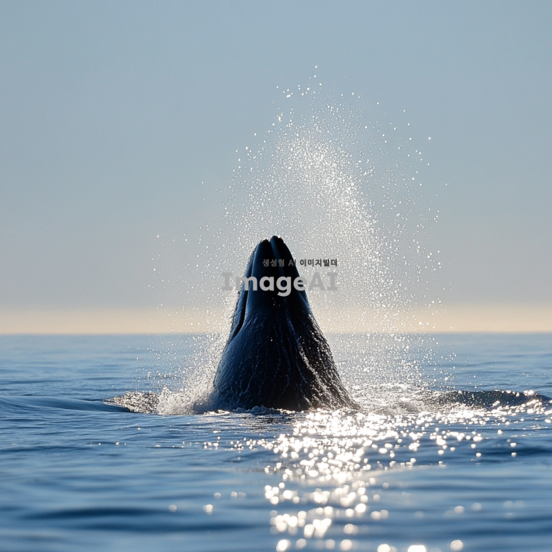 거대한 고래가 해수면 위로 물을 뿜으며 힘차게 솟아오르는 장면, 태양빛이 물방울에 반사되어 반짝이는 효과, 주변에 펼쳐진 푸른 바다와 맑은 하늘, 고래의 생동감 있는 움직임과 물의 역동적인 흐름을 강조, 자연의 웅장함과 아름다움을 표현