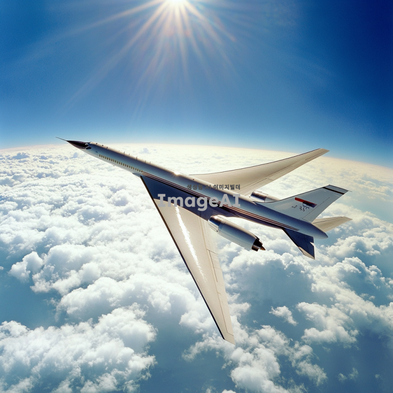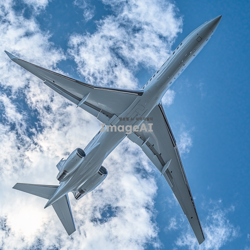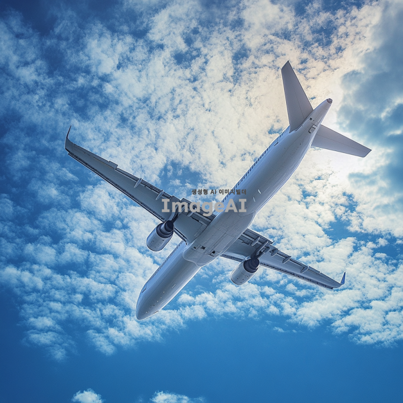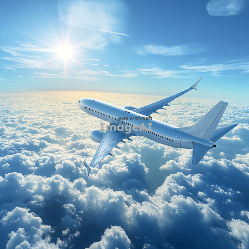 푸른 하늘을 배경으로 날아가는 현대식 제트 여객기의 역동적인 모습, 햇살을 받아 반짝이는 기체 표면과 구름 사이를 가로지르는 장면, 비행기의 세부적인 디자인과 날개 끝의 디테일이 강조된 이미지, 하늘 높이 비행하며 자유로움을 느끼게 하는 장면.