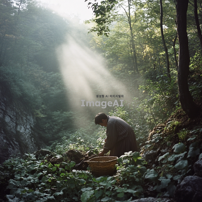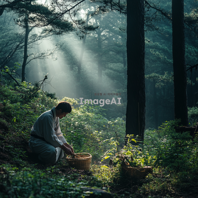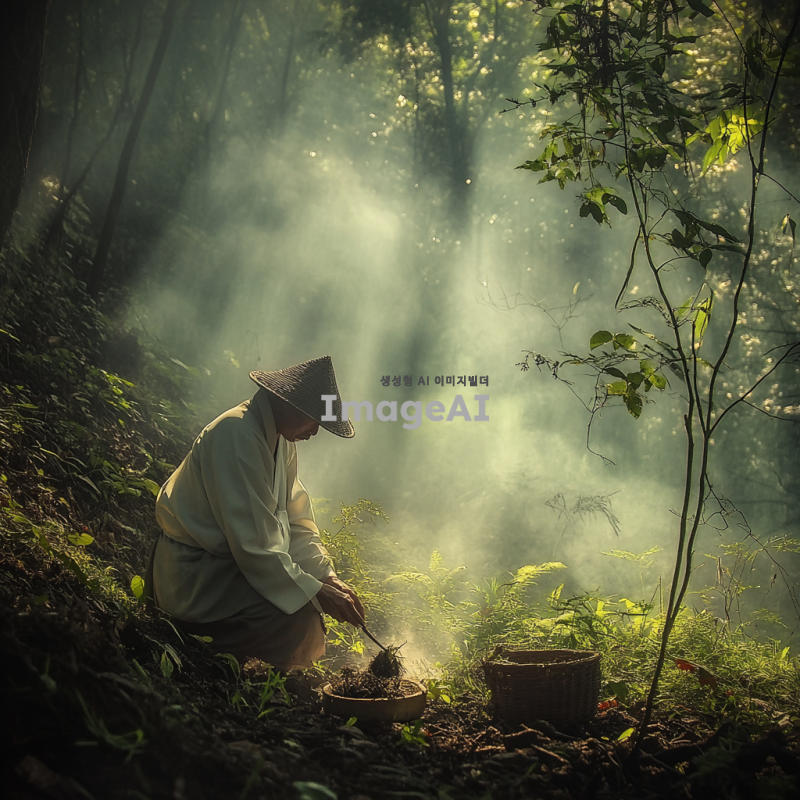 깊은 산속에서 산삼을 캐는 전통적인 복장의 한국인 남성, 주변은 울창한 숲과 안개로 가득 차 있으며, 이른 아침의 부드러운 햇살이 나무 사이로 비치는 장면, 남성은 집중하며 손으로 흙을 파고 있으며, 그의 옆에는 작은 바구니와 도구들이 놓여 있다, 자연과 조화를 이루는 고요하고 신비로운 분위기.