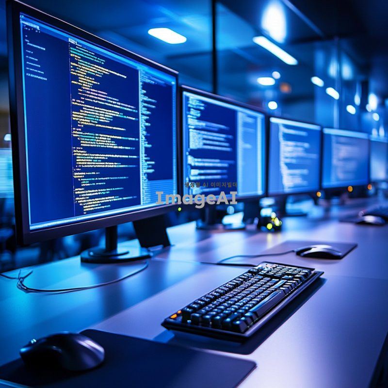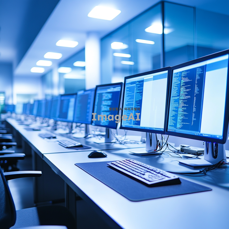 최신형 컴퓨터 여러 대가 나란히 놓여 있는 모습, 각각의 컴퓨터는 고해상도 모니터와 LED 조명이 장착되어 있으며, 깔끔하고 현대적인 디자인의 책상 위에 배치, 주변에는 다양한 컴퓨터 주변기기와 액세서리가 정돈되어 있는 사무실 환경, 조명은 밝고 선명하게 표현, 각 컴퓨터의 화면에는 서로 다른 소프트웨어나 그래픽이 실행 중인 모습, 전체적으로 정리된 느낌의 현대적인 사무실 공간.