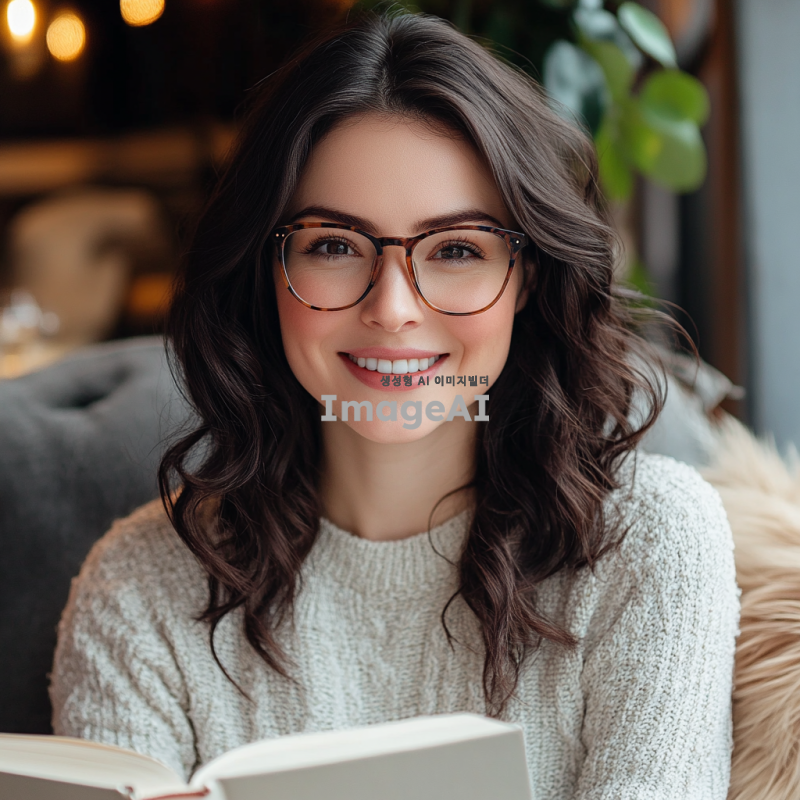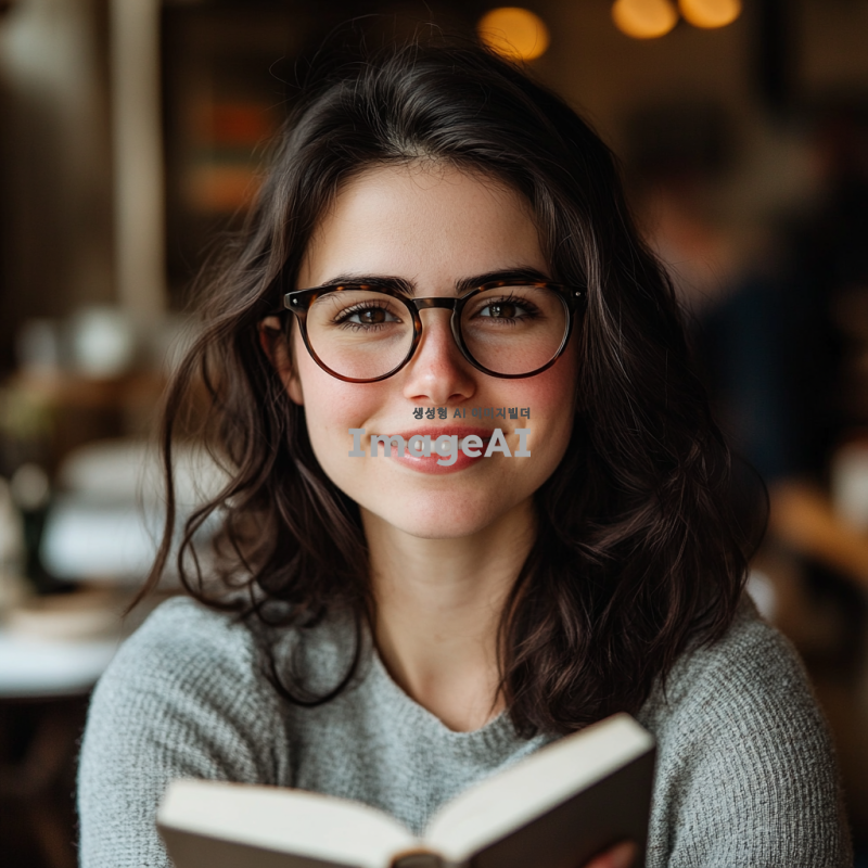 20대 초반의 여성, 지적이고 우아한 분위기, 짙은 갈색 머리카락, 자연스러운 웨이브 스타일, 세련된 디자인의 안경, 따뜻한 미소, 아늑한 카페 배경, 창문을 통해 들어오는 부드러운 자연광, 캐주얼하지만 세련된 복장, 책을 들고 있는 모습.
