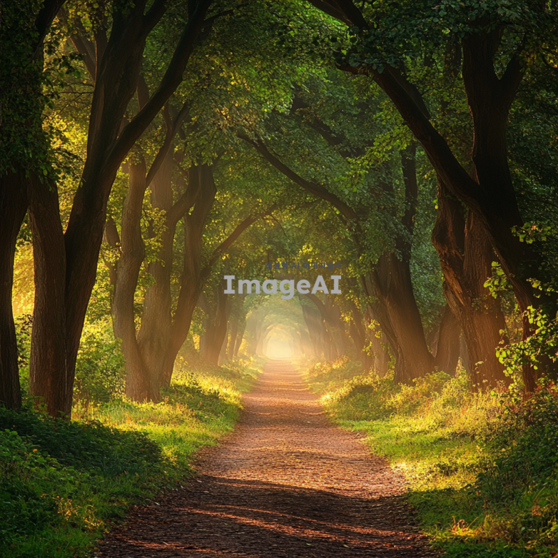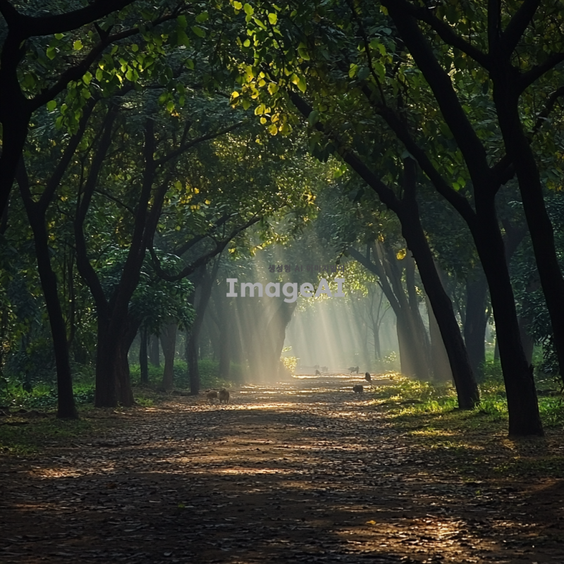 고요한 숲속의 아침 풍경, 안개가 살짝 낀 나무들 사이로 부드러운 햇살이 비치고, 다양한 녹색의 잎사귀들이 바람에 살랑거리는 모습, 작은 동물들이 평화롭게 활동하는 장면, 자연의 소리와 신선한 공기가 느껴지는 분위기, 숲길을 따라 이어지는 나무 터널, 생동감 넘치는 자연의 아름다움.