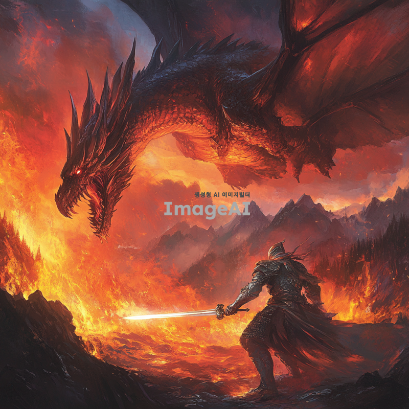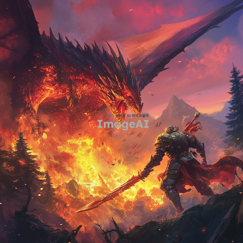 고대의 전사가 거대한 용과 전투를 벌이는 장면, 전사는 빛나는 갑옷을 입고 있으며 손에는 강력한 검을 쥐고 있다. 용은 불길을 뿜으며 하늘을 날고 있고, 주변은 불타오르는 숲과 산으로 둘러싸여 있다. 전사의 얼굴은 결연한 의지로 가득 차 있고, 용의 눈은 붉게 빛난다. 배경은 황혼의 하늘로, 붉은 노을이 전장의 긴장감을 더해준다. 전사의 갑옷은 세부 디테일이 정교하게 표현되어 있으며, 용의 비늘은 빛을 반사하여 은은하게 빛난다.