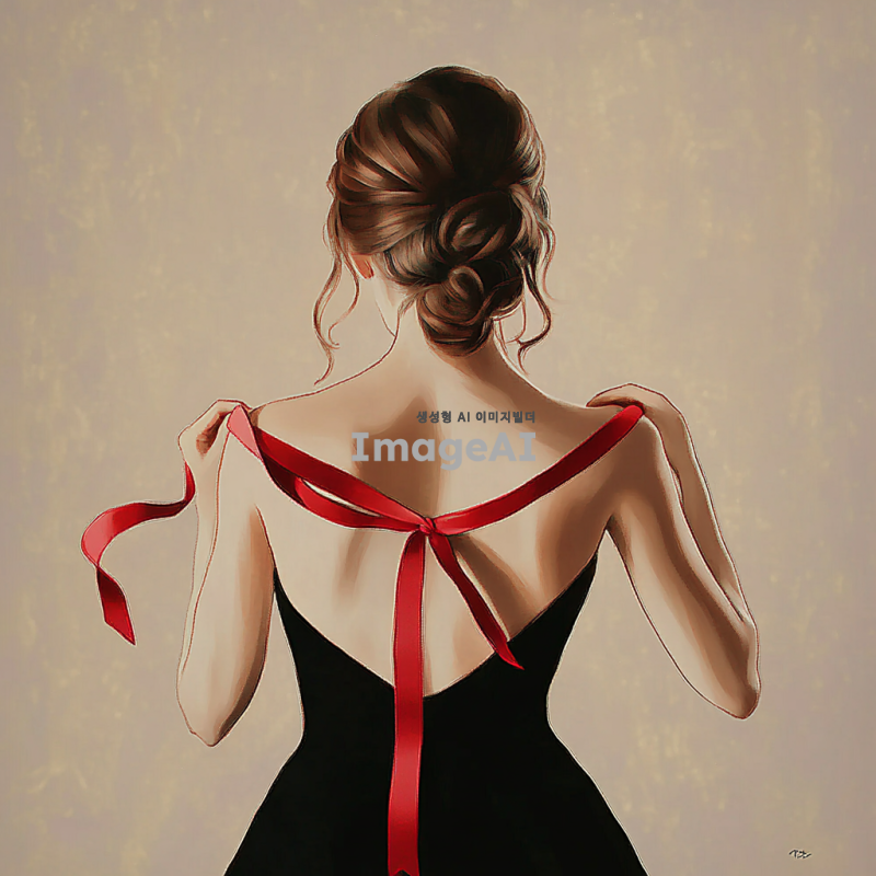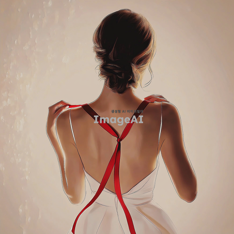 빨간색 리본 우아하게 묶는 모습 뒷모습 여성, 묶은머리, 자연광이 은은하게 비치는 배경, 따뜻하고 포근한 분위기, 고급스러운 느낌 강조.