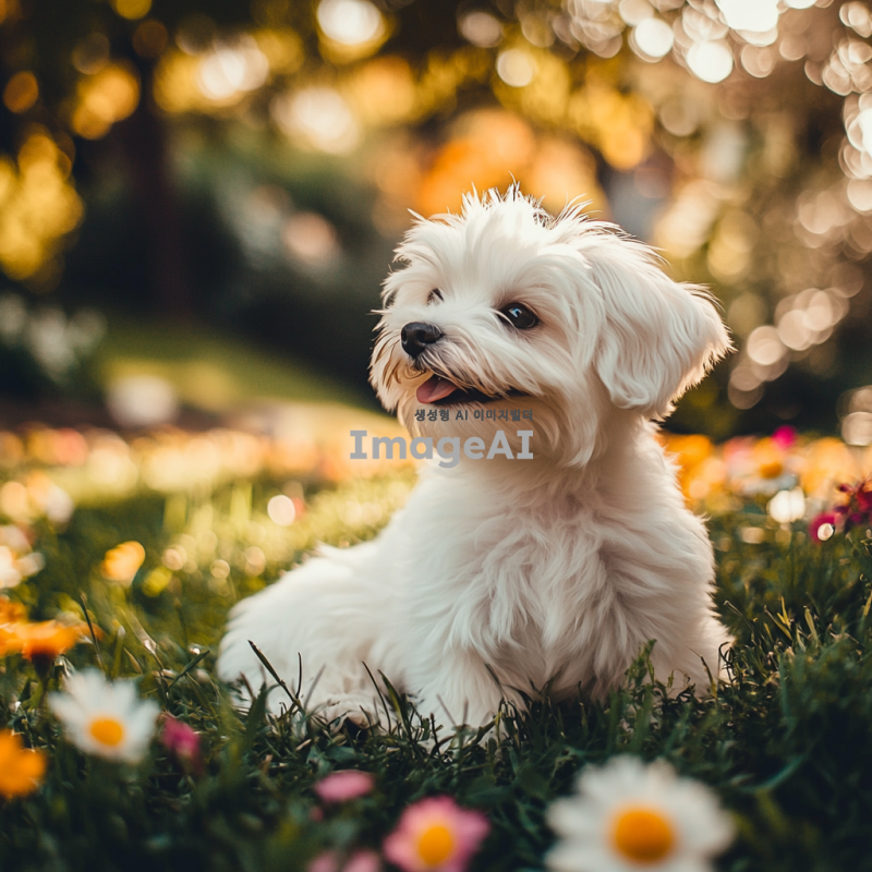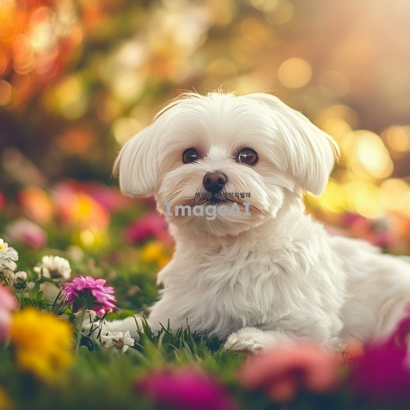 따뜻한 햇살 아래에서 풀밭에 앉아 있는 귀여운 말티즈 강아지, 부드럽고 풍성한 하얀 털, 크고 반짝이는 눈, 장난기 가득한 표정, 주변에는 알록달록한 꽃들이 만발해 있는 모습, 평화롭고 포근한 분위기.