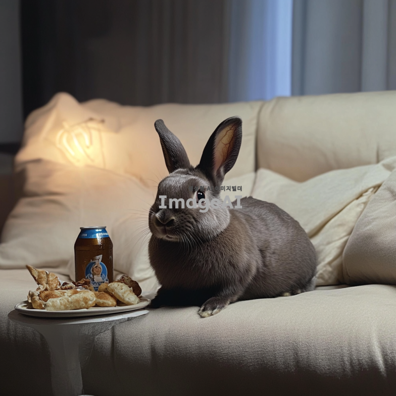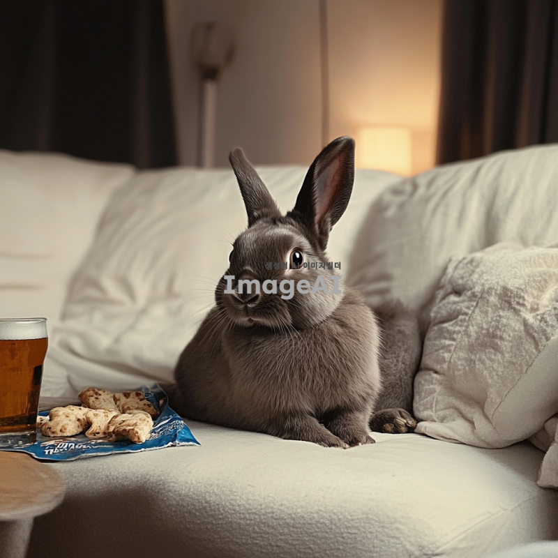 진한 회색 샴토끼가 아이보리색 쇼파에 앉아 영화 감상 중인 모습, 쇼파 테이블에는 맥주와 다양한 안주가 놓여 있는 장면, 아늑하고 편안한 분위기의 거실, 부드러운 조명으로 따뜻한 느낌 강조.