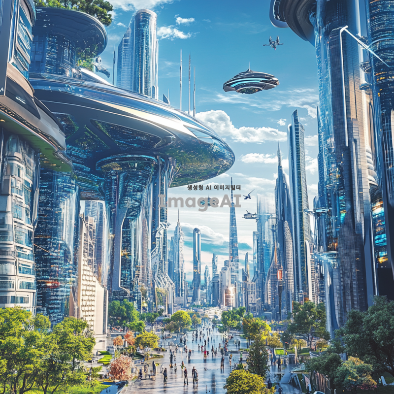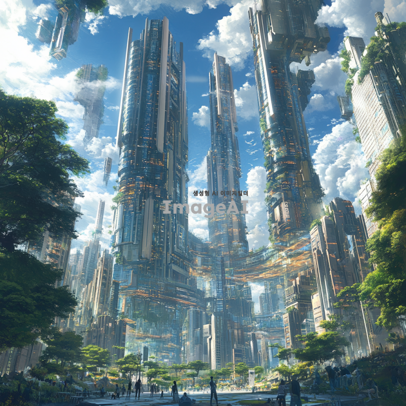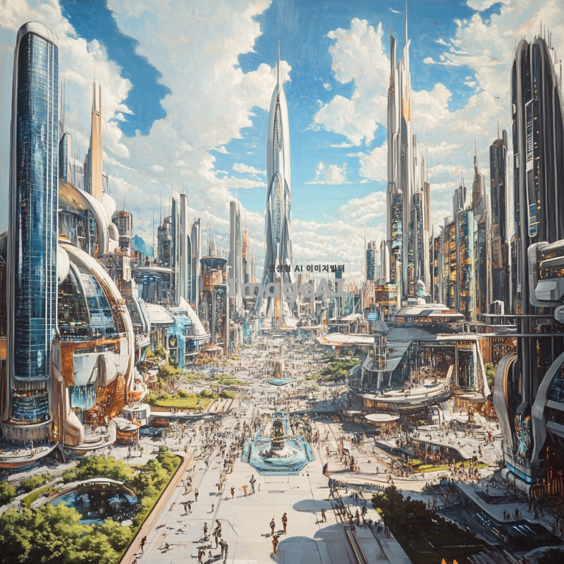 현대적이고 미래지향적인 도시의 전경, 고층 빌딩들이 하늘 높이 솟아 있으며, 다양한 건축 양식이 조화를 이루고 있는 모습, 푸른 하늘과 함께 반짝이는 유리창, 도시의 거리에는 사람들이 활기차게 움직이고 있으며, 녹지 공간과 공공 예술 작품들이 곳곳에 자리잡고 있는 모습, 기술과 자연이 조화를 이루는 도시의 풍경.