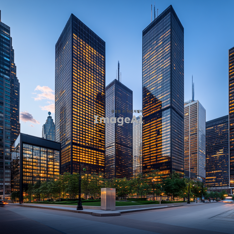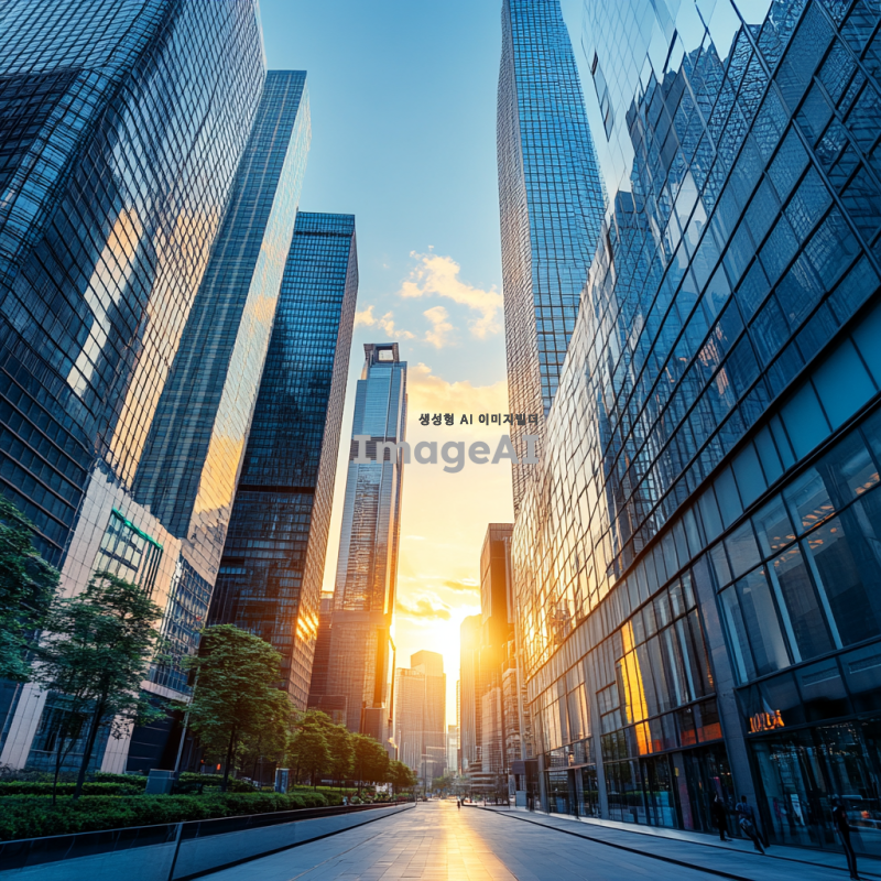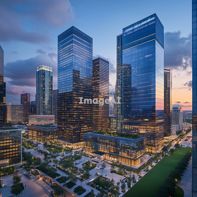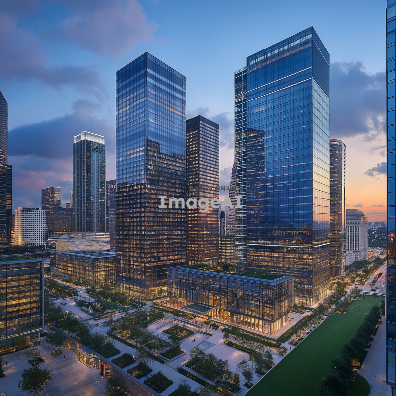 현대적인 도시 풍경, 다양한 건축 양식의 조화, 푸른 하늘 아래 빛나는 고층 빌딩, 유리와 강철로 구성된 세련된 외관, 거리의 활기찬 분위기, 도시의 역동성과 아름다움을 강조한 장면, 자연과 조화로운 도시 환경, 녹지 공간과 공공 예술 작품이 어우러진 모습, 일몰 시간의 따뜻한 빛이 건물에 반사되는 장면.