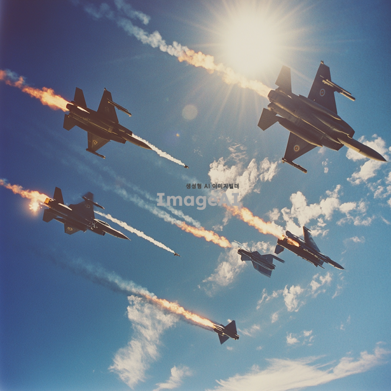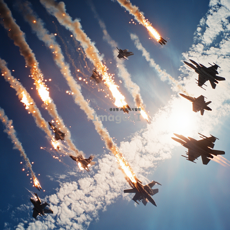 푸른 하늘을 배경으로 다양한 전투기가 공중에서 역동적으로 전투를 벌이는 장면, 전투기들은 최신식 기술을 자랑하며, 빠른 속도로 하늘을 가로지르며 기동하고 있다. 각 전투기는 서로를 향해 다양한 각도에서 공격을 시도하며, 하늘에는 연기와 불꽃이 어우러져 긴장감이 감돈다. 태양빛이 전투기 표면에 반사되어 빛나고, 구름 사이로 전투기의 실루엣이 드러난다. 전체적인 분위기는 긴박하고 스릴 넘치는 전투의 한가운데에 있는 듯한 느낌을 준다.