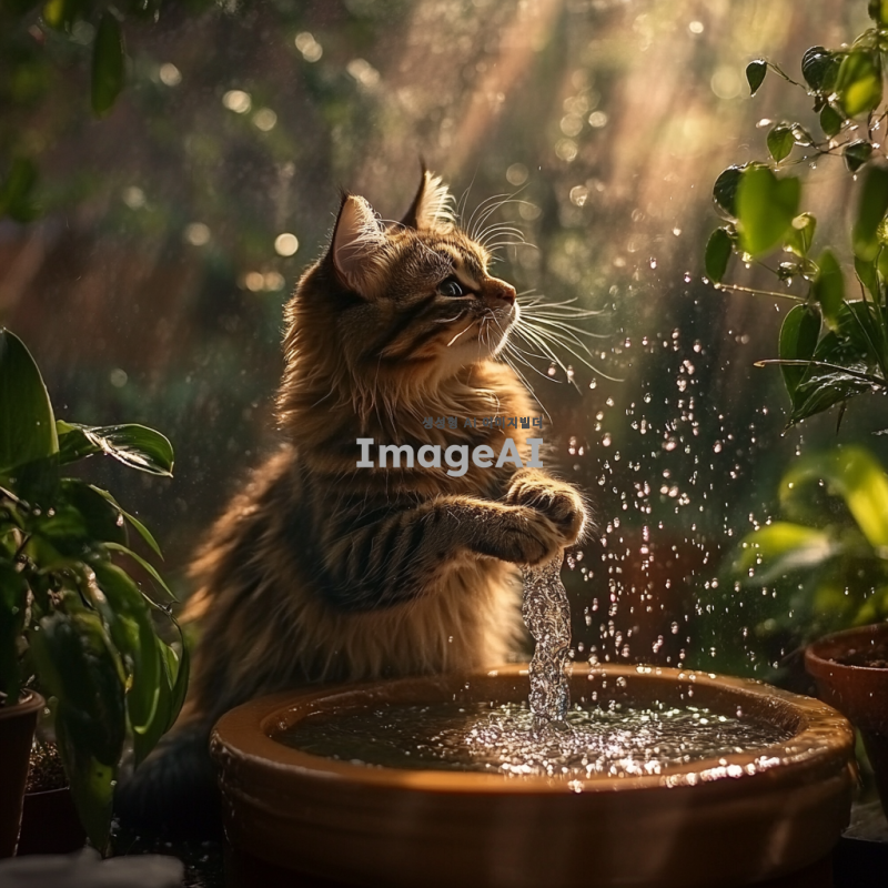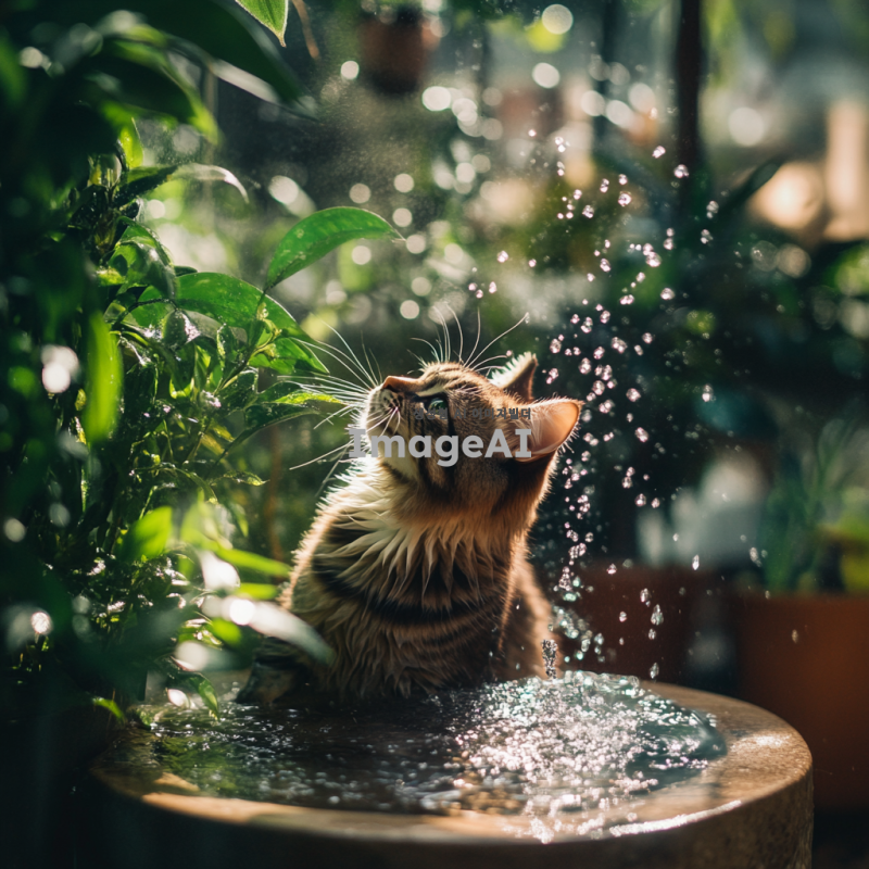 귀여운 고양이가 작은 분수대에서 물을 장난스럽게 툭툭 치며 놀고 있는 장면, 주변에는 초록색 식물들이 있고, 고양이의 털은 햇빛을 받아 반짝이며, 물방울이 공중에서 빛을 반사하는 모습, 배경은 부드러운 자연광으로 가득한 정원.