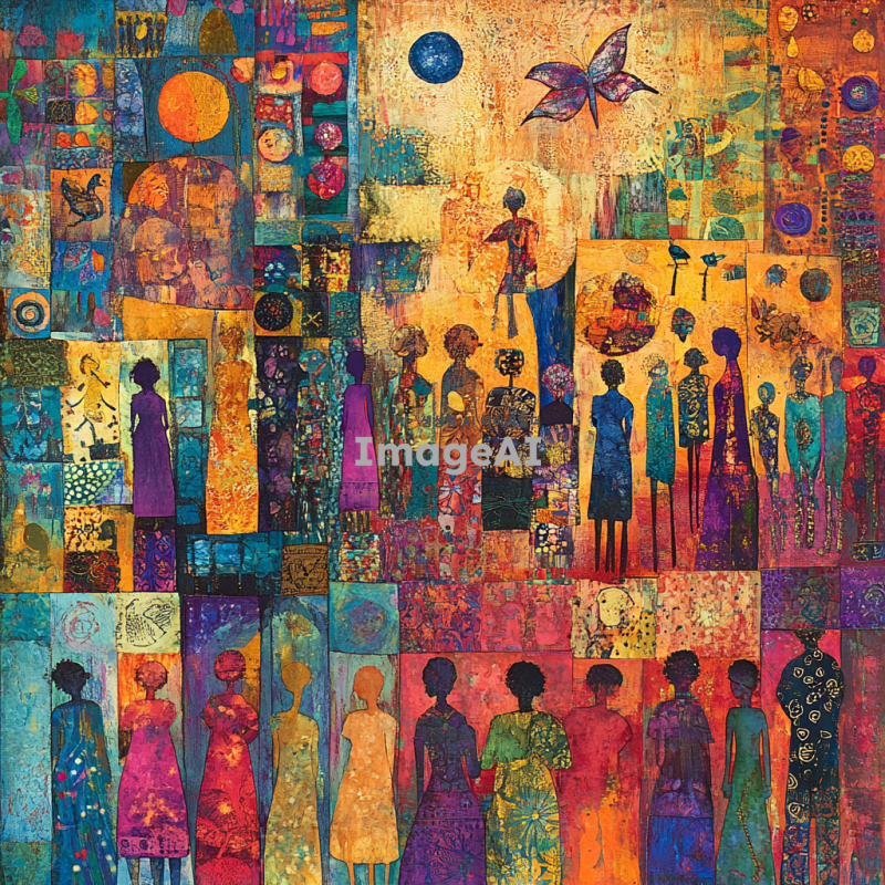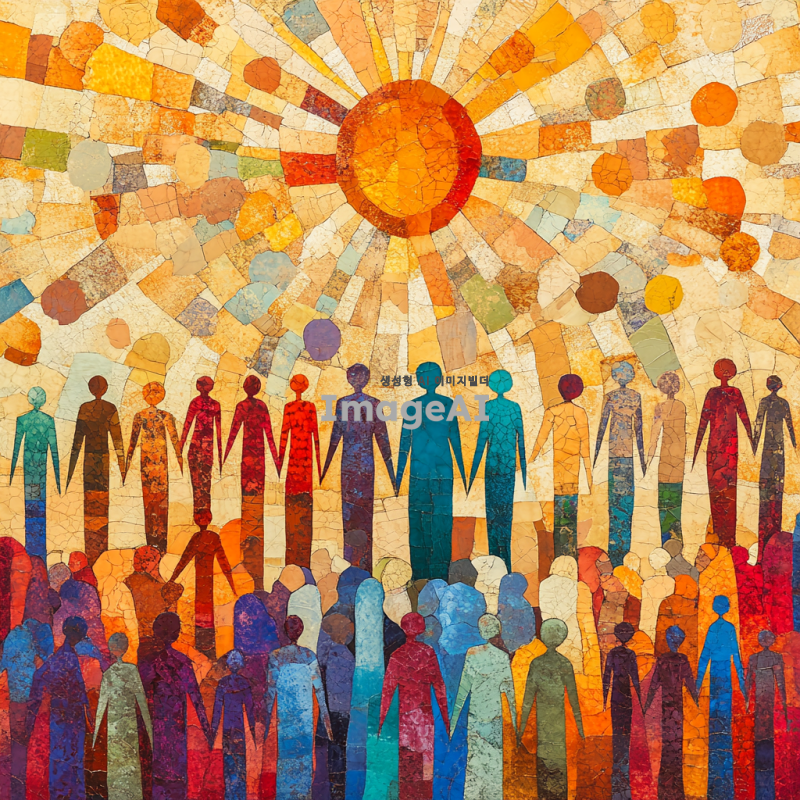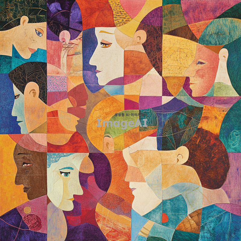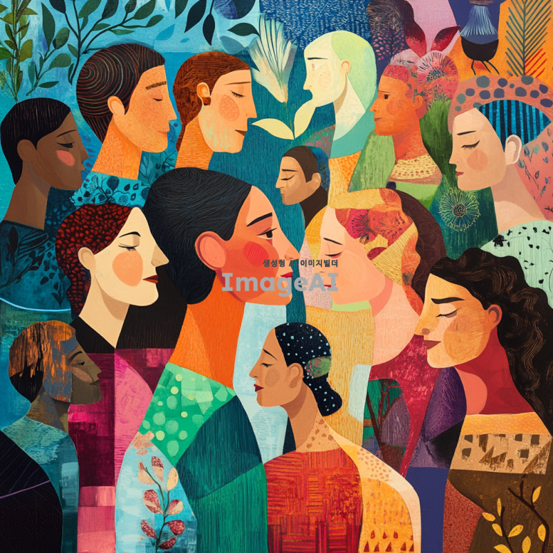 성인지감수성을 주제로 한 이미지: 다양한 문화적 배경을 가진 사람들이 서로 존중하고 협력하는 장면, 서로 다른 성별과 나이의 사람들이 평등하게 대화하는 모습, 포용성과 다양성을 상징하는 다양한 색상의 추상적 패턴, 평등과 화합을 나타내는 상징적인 이미지, 서로를 이해하고 지지하는 모습을 표현하는 따뜻한 분위기의 장면.