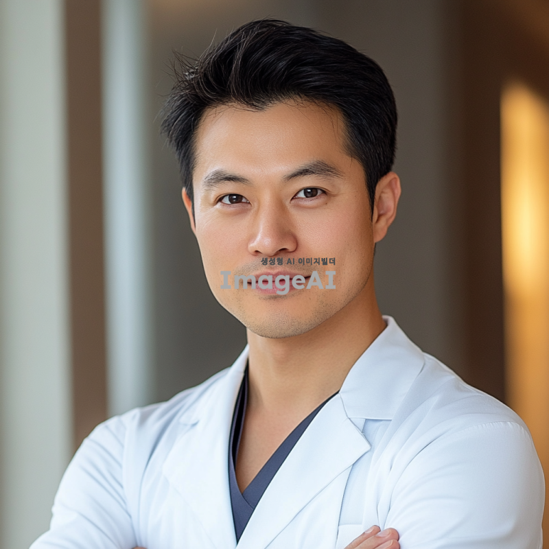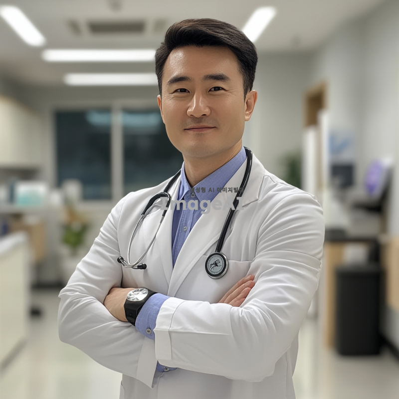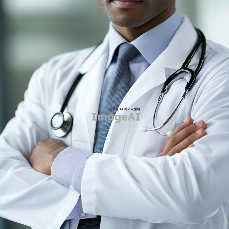 남자의사 한명, 깔끔한 머리 팔짱 낀 자세, 상반신(허리까지)