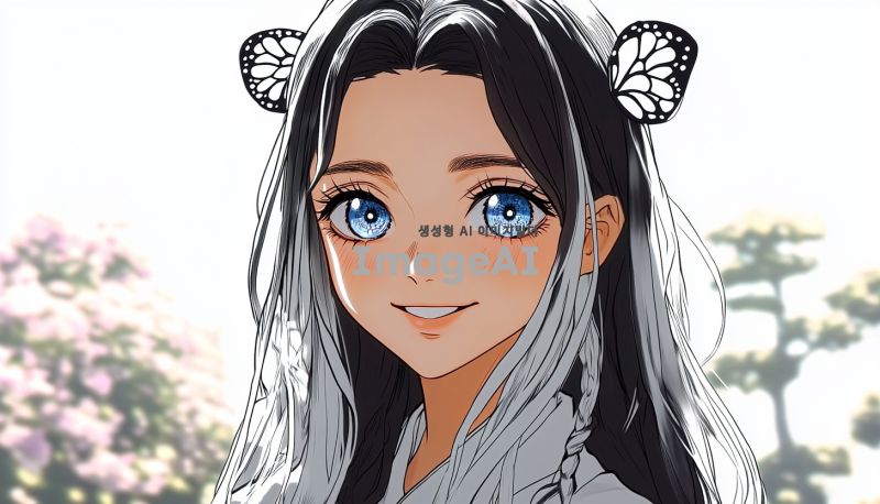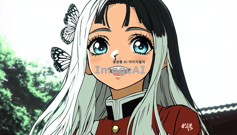 흰색 장발머리와 푸른 눈을 가진 소녀가 귀멸의 칼날 대원복을 입고 밝게 웃고 있는 모습, 배경은 전통 일본식 정원, 소녀의 표정은 활기차고 생기 넘치는 느낌, 자연광이 부드럽게 비추는 장면, 애니메이션 스타일, 디테일이 풍부한 복장과 머리카락 표현, 따뜻하고 평화로운 분위기.