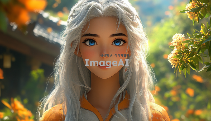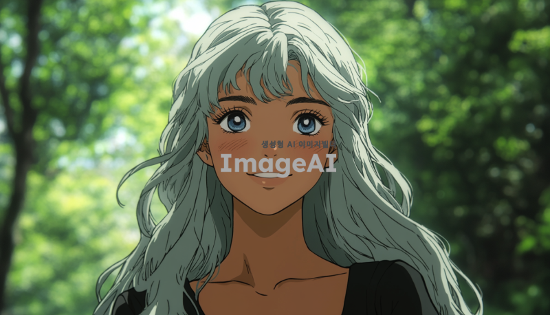 흰색 장발에 푸른 눈을 가진 소녀가 귀살대원복을 입고 희미하게 웃고 있는 모습, 부드러운 조명과 배경은 자연 속에서 조화롭게 어우러진 장면, 섬세한 디테일과 따뜻한 분위기, 애니메이션 스타일.