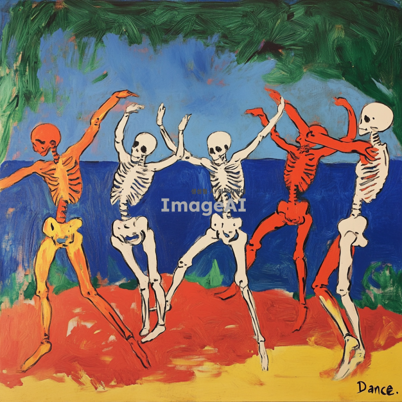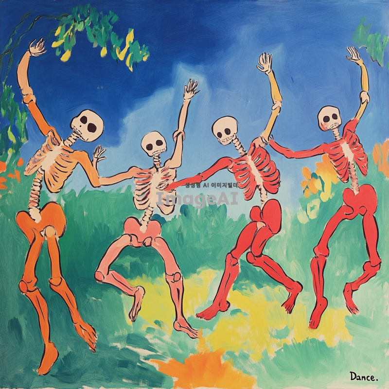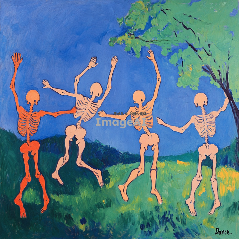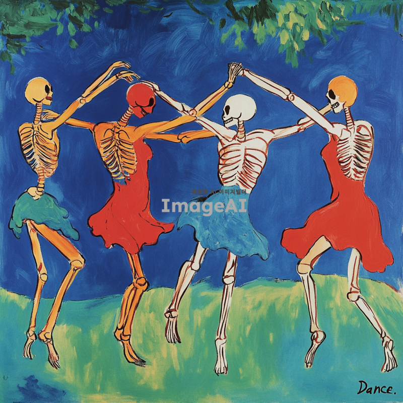 앙리 마티스의 "춤" 그림을 참고하여, 해골들이 같은 포즈로 춤을 추고 있는 장면. 밝고 대조적인 색상 사용, 배경은 단순한 자연 풍경, 해골들은 유쾌하고 경쾌한 분위기.
