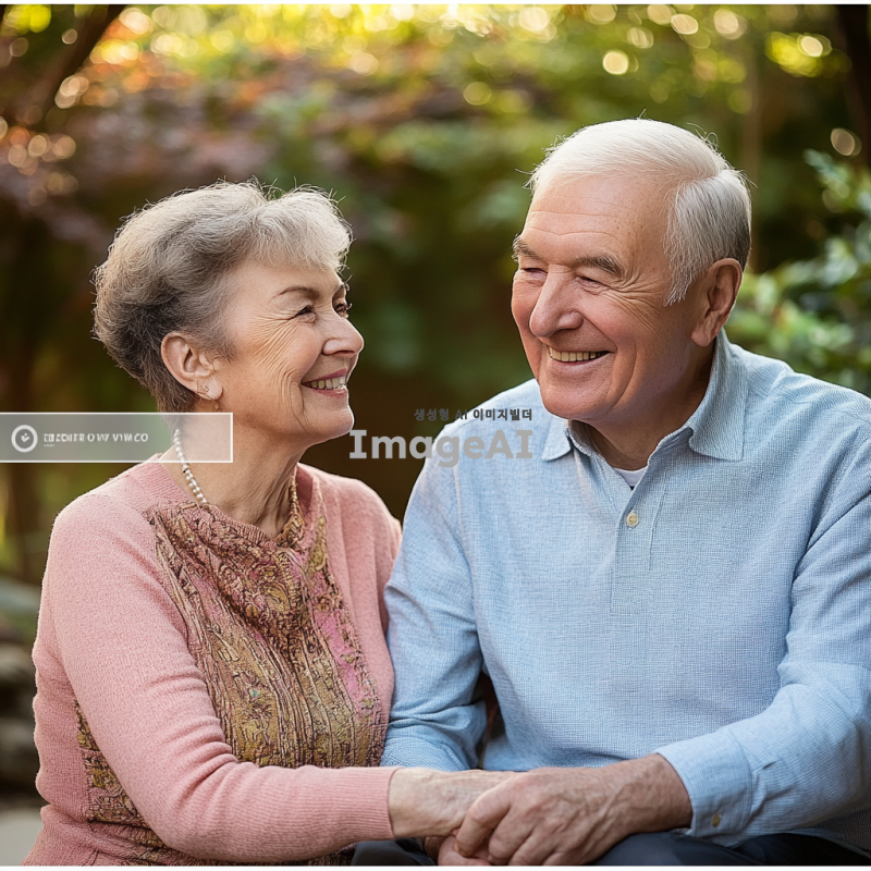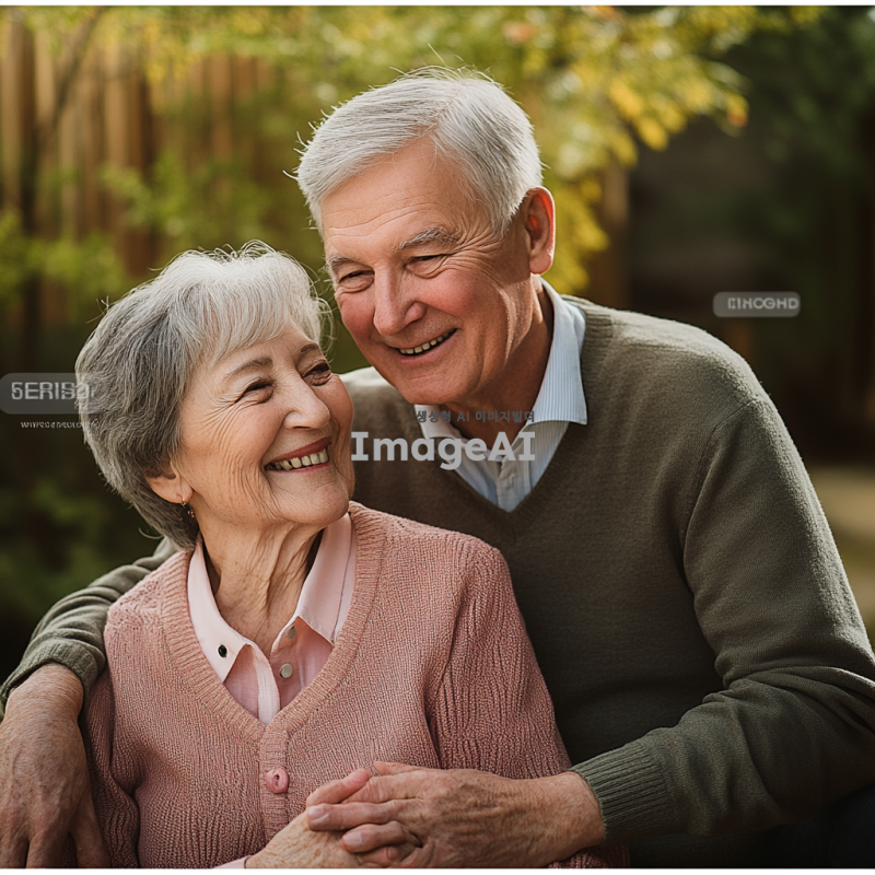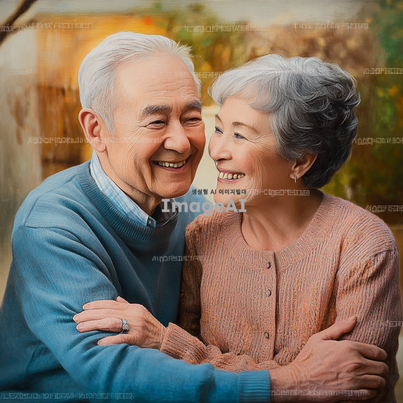 밝고 따뜻한 미소를 짓고 있는 할머니와 할아버지의 초상화, 자연스러운 배경, 부드러운 조명, 따뜻한 색감, 친근하고 행복한 분위기, 주름이 자연스럽게 드러나는 디테일, 건강하고 활기찬 모습, 서로를 바라보며 웃는 장면.