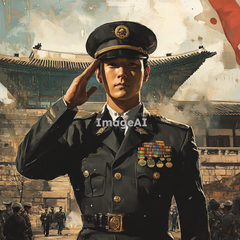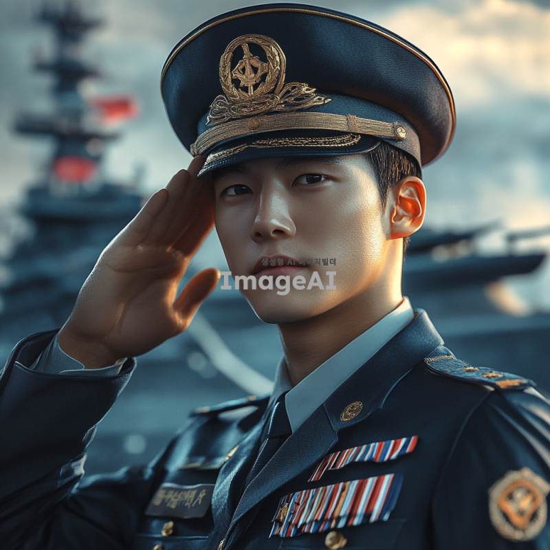 한국 해군 군인이 경례하는 장면, 군복과 모자가 잘 갖춰진 모습, 배경은 한국 해군의 상징적인 장소나 훈련소, 엄숙하고 진지한 분위기, 군인의 자세는 정면을 향해 경례하는 모습, 선명한 디테일과 현실적인 표현, 한국 국기의 색상 요소 포함.