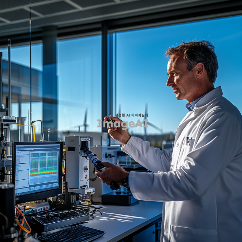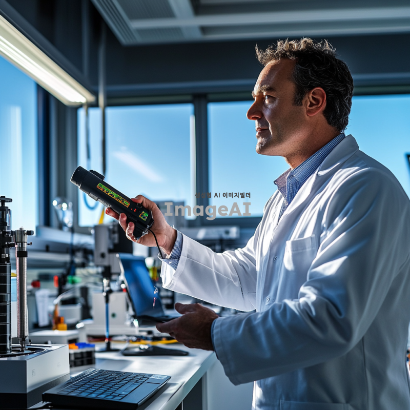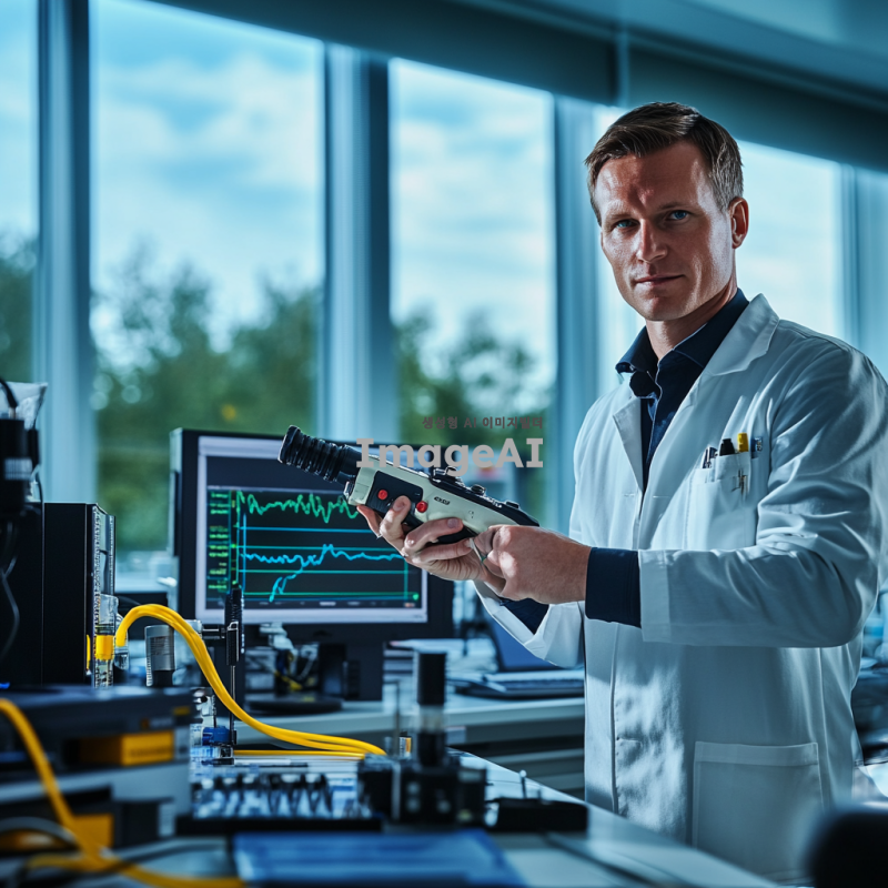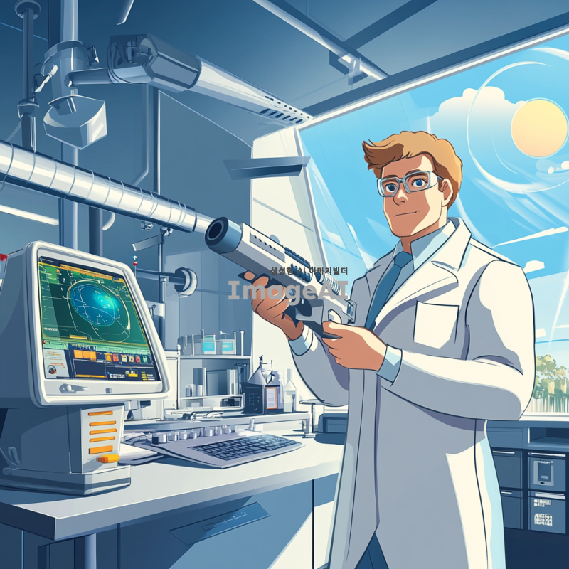 최신형 스피드건을 손에 들고 있는 과학자가 도플러 효과를 설명하는 장면. 배경은 현대적인 연구실이며, 스피드건의 디지털 화면에 속도 수치가 표시되어 있다. 과학자는 실험 결과를 보며 만족스러운 표정을 짓고 있으며, 주변에는 다양한 과학 장비와 노트북이 놓여 있다. 연구실 창문 너머로는 푸른 하늘과 햇살이 비치는 풍경이 보인다.