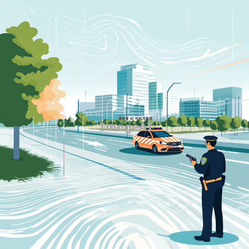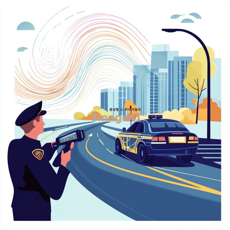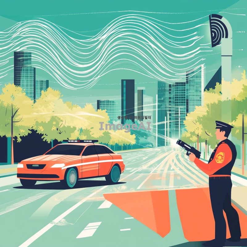 도플러 효과를 설명하기 위한 예시로, 스피드건을 사용하여 도로 위를 빠르게 지나가는 자동차의 속력을 측정하는 장면. 스피드건을 들고 있는 교통 경찰이 도로 옆에 서 있으며, 자동차는 고속으로 주행 중. 자동차 주변에 속도감과 도플러 효과를 상징하는 파동이나 선이 시각적으로 표현되어 있음. 배경은 도시의 도로로, 현대적인 건물과 나무들이 보임. 날씨는 맑고 햇빛이 밝게 비추고 있어 생동감 있는 장면.