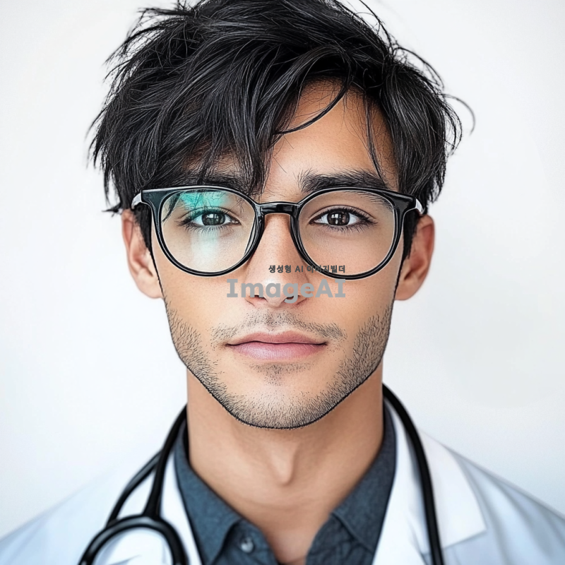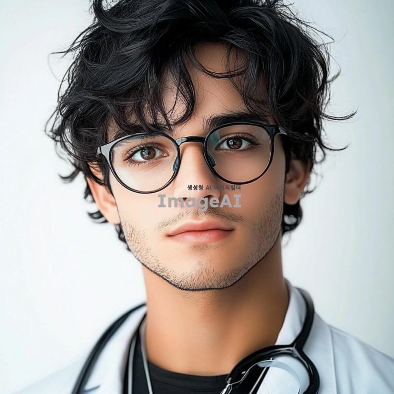 연갈색 눈동자와 검은 머리카락을 가진 젊은 남성 미소년, 약간 측면 각도로 얼굴을 중심으로 하얀 배경 위에 서 있는 모습. 안경을 착용하고 있으며 목에 청진기를 두르고 있는 의사.