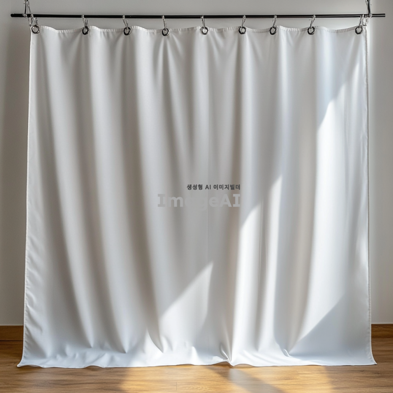 실내에 깨끗한 하얀 현수막 천. 사방에 타공 아일렛이 큼지막하게 박혀있다. 주름없이 팽팽하게.