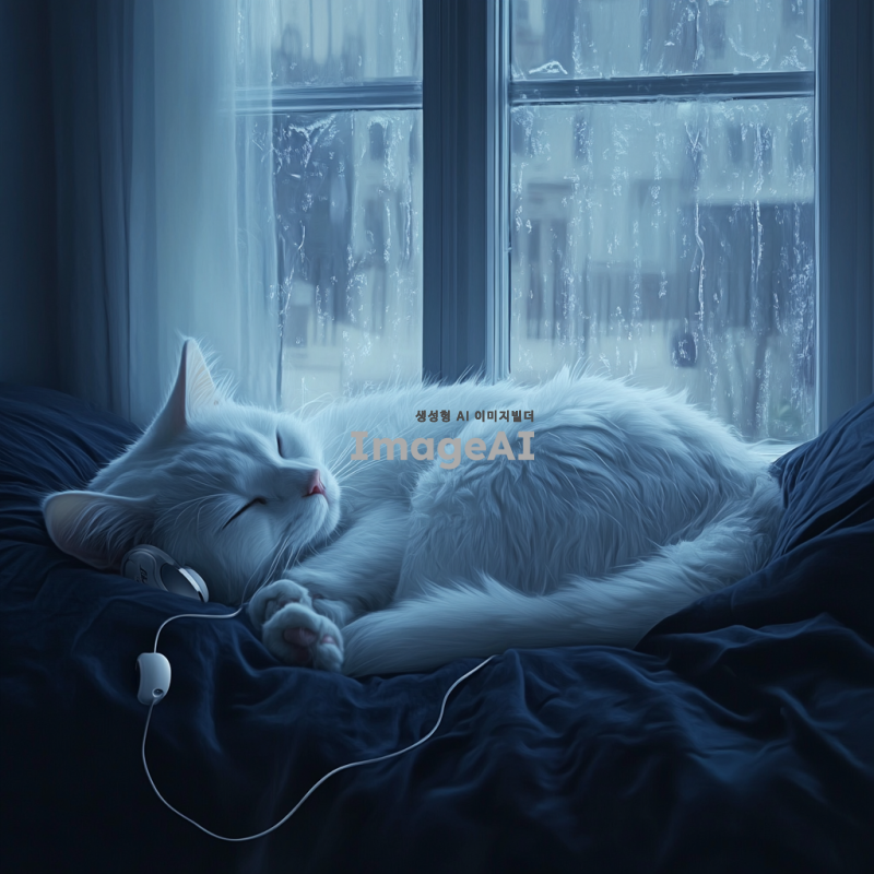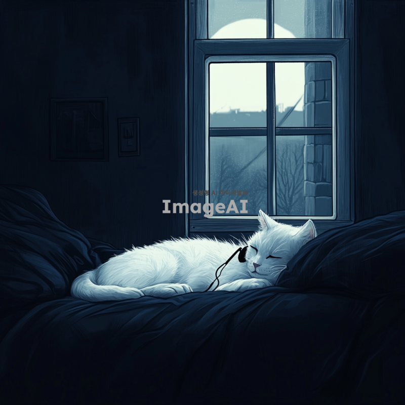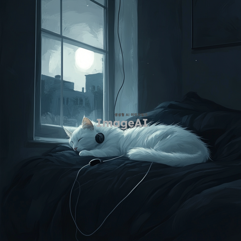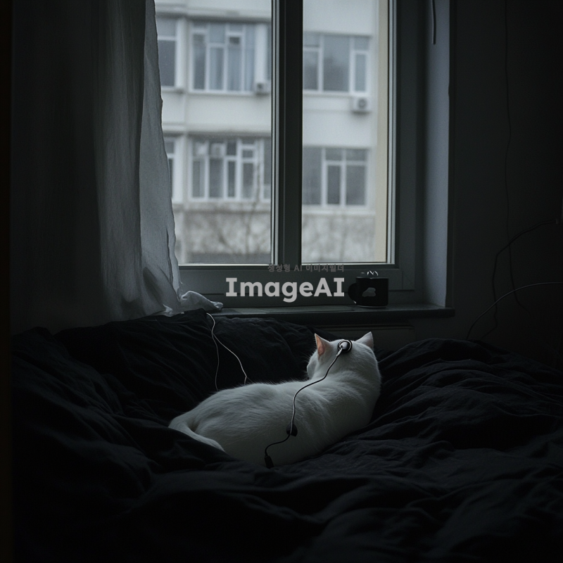 어두운 새벽, 창문 옆 침대에 편안하게 누워 있는 하얀 고양이, 이어폰을 착용하고 음악을 듣는 모습, 창문 밖으로 보이는 희미한 하얀 달빛, 차갑지만 아늑한 분위기, 고양이의 털은 부드럽고 윤기가 흐르는 모습, 침대는 어두운 검정색 침구로 덮여 있음, 고양이의 표정은 새침하고 무표정한 느낌.