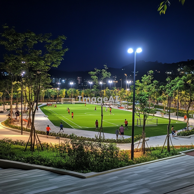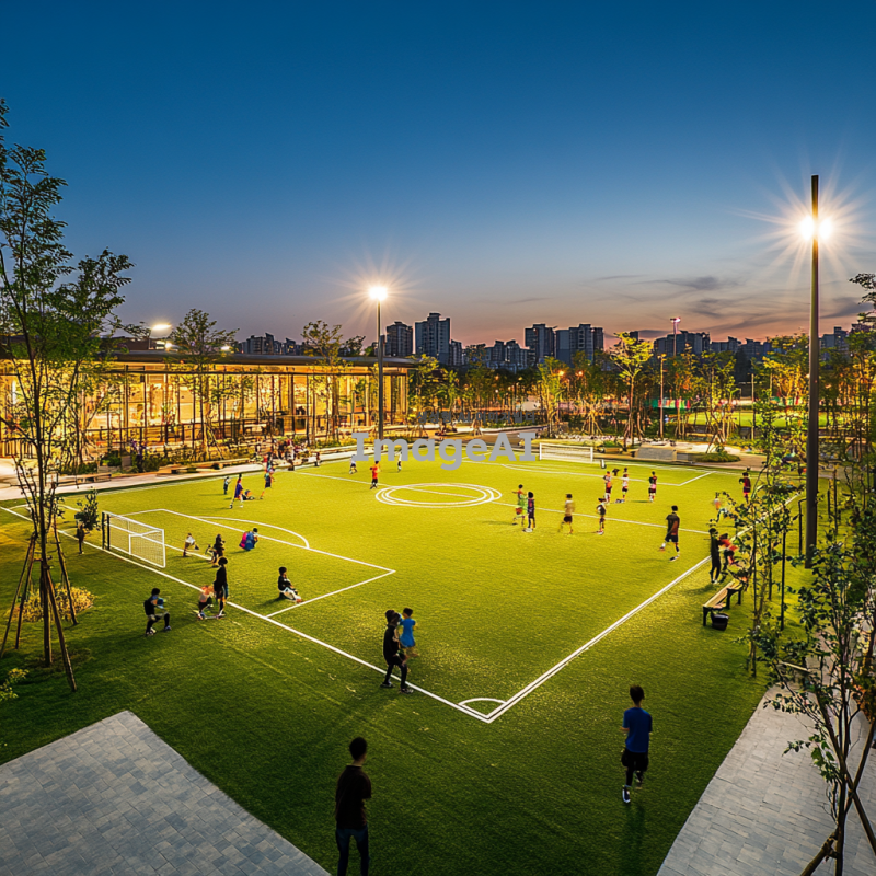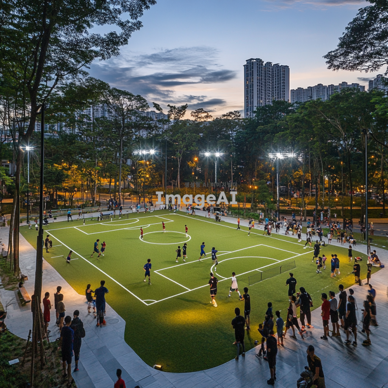 현대적인 풋살 경기장, 인조 잔디, 조명 시스템, 관중석, 주변에 나무와 녹지가 어우러진 환경, 활기찬 분위기, 다양한 연령대의 사람들이 경기를 즐기는 모습, 가족과 친구들이 함께 응원하는 장면, 안전하고 편안한 시설, 친환경적인 디자인 요소, 도시 속의 스포츠 오아시스.