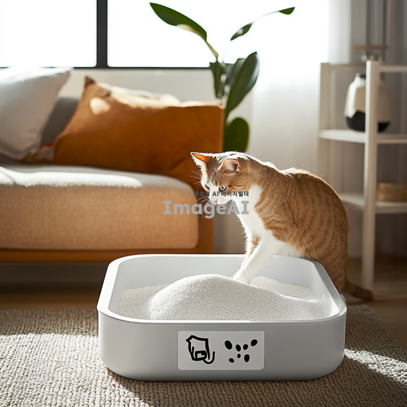 화이트 실리카겔과 벤토나이트가 섞인 고양이모래에 고양이가 화장실을 보고 있고, 깔끔한 인테리어의 거실에 있는 모습