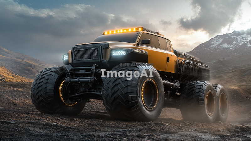 강력한 엔진 소리를 내며 거친 지형을 달리는 힘찬 트럭, 커다란 바퀴와 견고한 차체, 강력한 헤드라이트가 어두운 길을 밝히고 있는 모습, 현대적이고 날렵한 디자인, 강렬한 색상과 메탈릭한 질감, 트럭의 웅장함과 힘을 강조하는 역동적인 각도.
