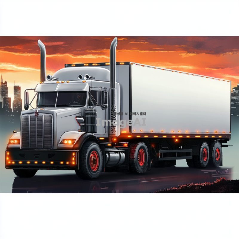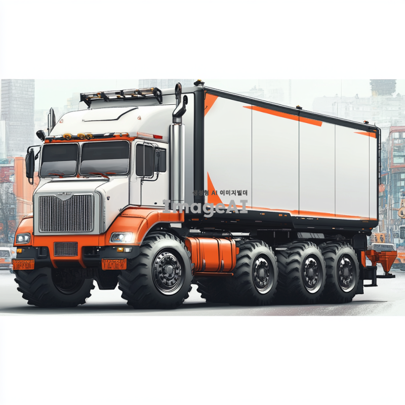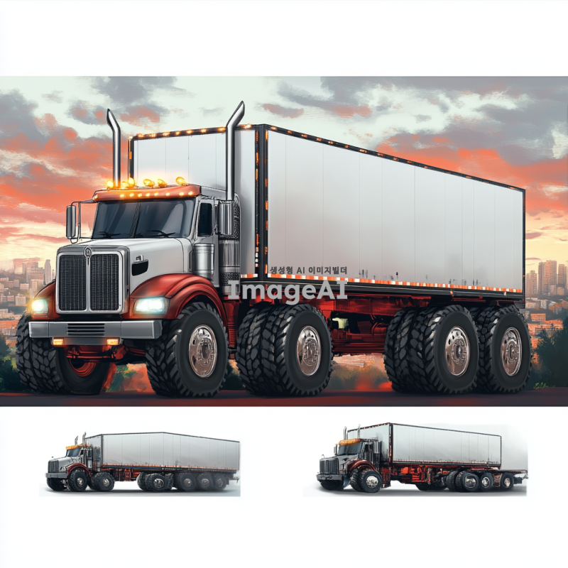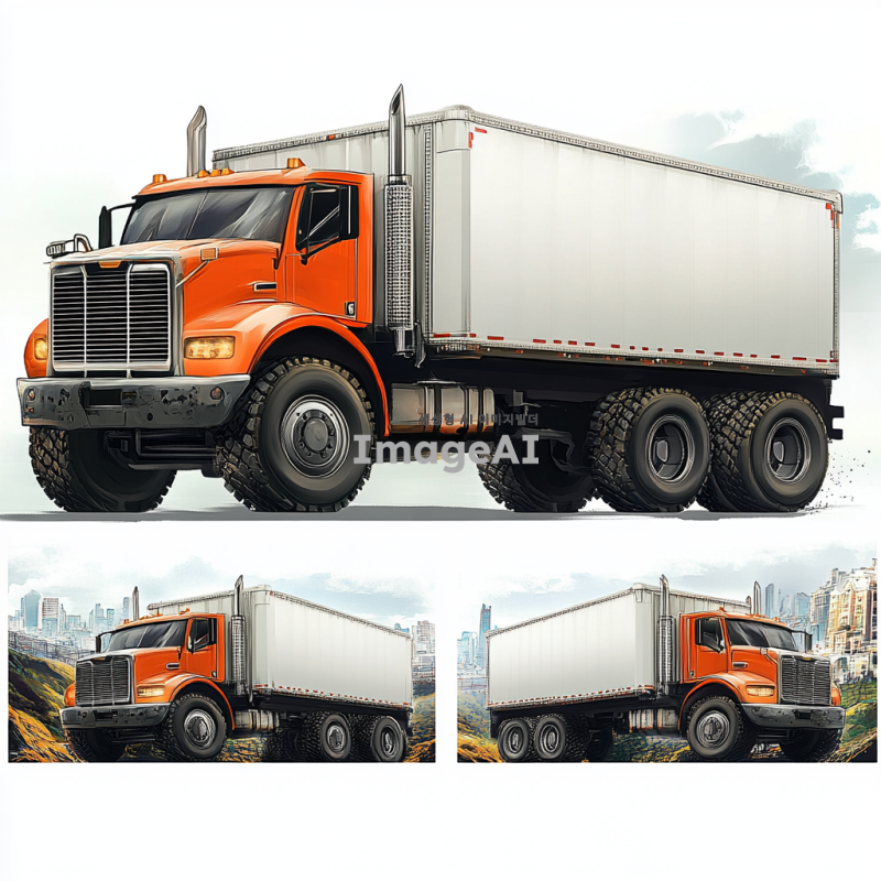 강력한 트럭, 거대한 바퀴, 견고한 차체, 현대적 디자인, 강력한 엔진 소리, 도시와 자연을 아우르는 배경, 역동적인 움직임, 강렬한 색상, 세부적인 메커니즘, 트럭의 위엄과 힘을 강조하는 구도.