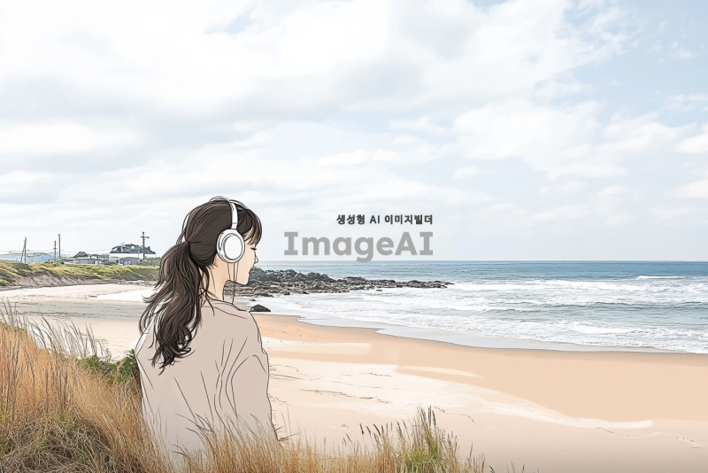 20대 아름다운 한국 여성이 헤드폰을 착용하고 바닷가를 거닐고 있는 장면, 맑은 하늘과 잔잔한 파도가 배경으로 어우러져 있으며, 여인은 편안하고 행복한 표정을 짓고 있다. 그녀의 긴 머리카락이 바람에 살짝 흩날리고 있으며, 캐주얼한 가을 옷차림을 하고 있다. 자연스럽고 사실적인 색감으로 표현된 장면.