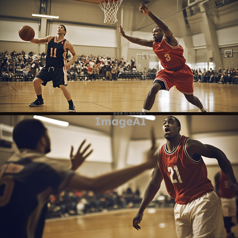 1. 첫 번째 이미지: 체육관 안에서 농구 시합이 진행 중인 장면. 한 선수가 농구공을 들고 레이업을 시도하고 있으며, 다른 선수는 수비 자세를 취하고 있다. 선수들의 표정은 집중되어 있고, 배경에는 관중들이 응원하고 있는 모습이 보인다.