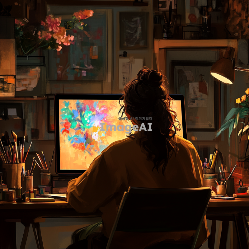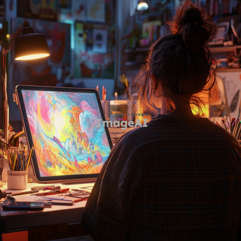 디지털 아트 스튜디오에서 타블렛으로 그림을 그리고 있는 작업자의 뒷모습, 조명은 따뜻하고 부드러운 분위기를 연출하며, 작업자는 편안한 자세로 앉아 있으며, 주변에는 다양한 예술 도구와 참고 자료가 흩어져 있는 장면. 작업자의 머리카락은 자연스럽게 흘러내리고, 작업 중인 화면에는 생동감 있는 색채의 예술 작품이 부분적으로 보인다.