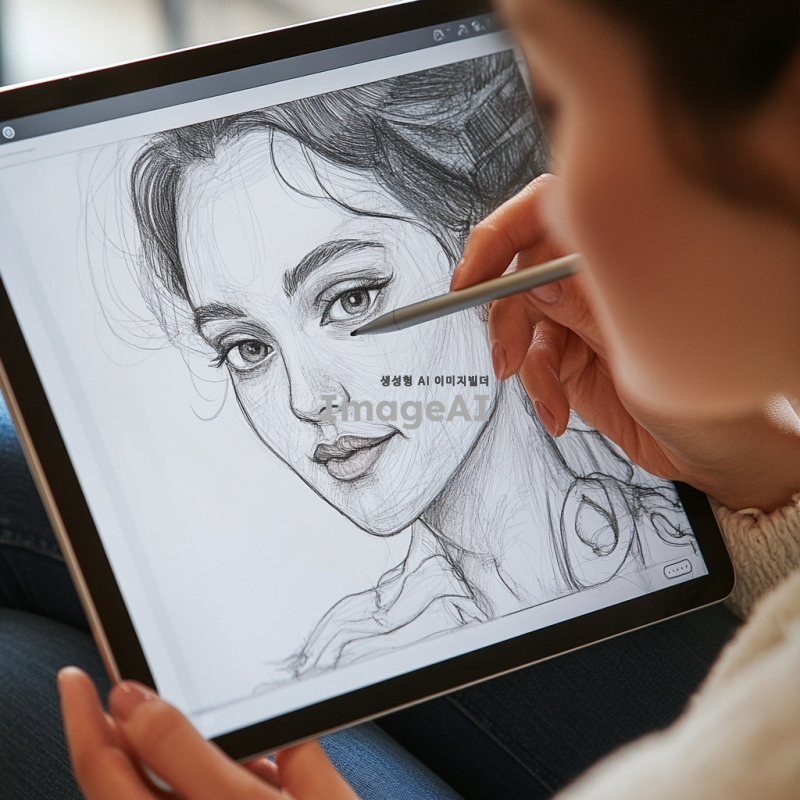 타블렛으로 인물 스케치를 그리는 사람의 모습, 집중한 표정, 현대적인 작업 공간, 자연광이 비치는 창문, 창의적인 분위기, 디지털 아트 작업 중인 장면, 세밀한 손동작, 테크놀로지와 예술의 조화, 편안한 의자에 앉아 있는 모습, 따뜻한 색감의 조명.
