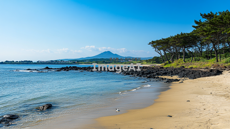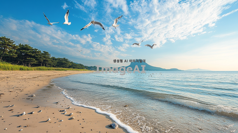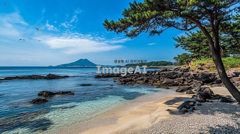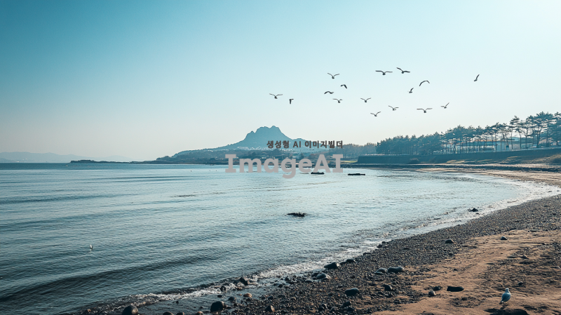 제주바다의 고요하고 평화로운 풍경, 맑고 푸른 하늘 아래 잔잔히 물결치는 바다, 멀리 보이는 한라산의 실루엣, 해변의 부드러운 모래와 드문드문 놓인 조약돌, 해안선을 따라 늘어선 소나무와 야자수, 따뜻한 햇살이 비치는 오후의 여유로운 분위기, 자연의 아름다움과 평화로움을 강조한 장면, 바다 위로 날아다니는 갈매기들, 전체적으로 차분하고 편안한 색감과 조화로운 구도.