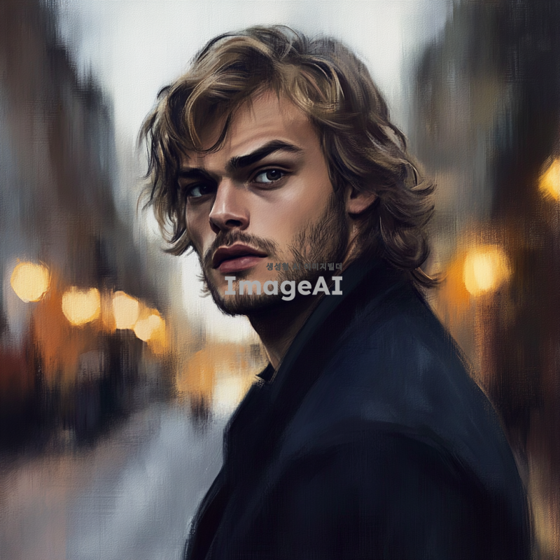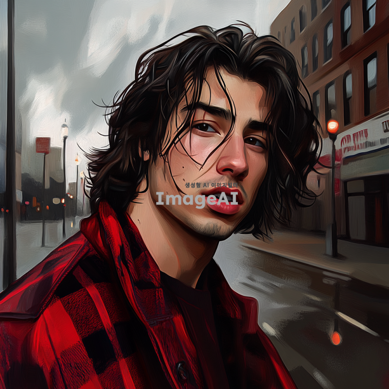 20대 초반의 젊은 남성이 도시의 거리에서 홀로 서 있는 장면, 캐주얼한 옷차림에 약간 긴 머리, 주변은 흐릿하게 표현되어 있으며 그의 표정은 약간의 불안과 결단력을 동시에 나타냄, 주변에 어두운 하늘과 희미한 가로등 불빛이 어우러져 고독한 분위기를 강조함, 현대적이고 사실적인 일러스트 스타일
