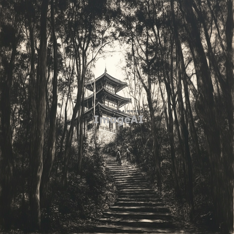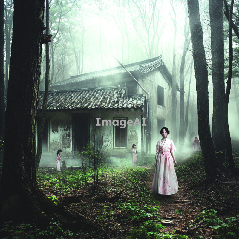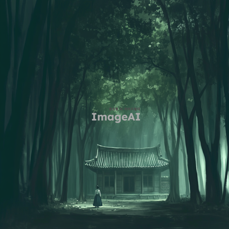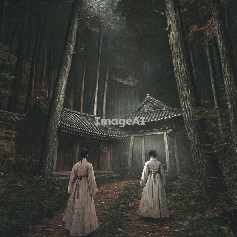 조선시대의 음산한 분위기를 가진 어두운 숲, 안개가 자욱하게 깔린 길, 고풍스러운 한옥이 배경에 위치하며, 흐릿한 달빛이 드리워진 밤의 정경. 기와지붕이 있는 오래된 사당, 나무 사이로 스며드는 희미한 빛, 바람에 흔들리는 나뭇잎 소리. 그림자 속에 숨어있는 신비로운 형체, 고요한 분위기 속에서 느껴지는 긴장감. 조선시대 전통 의상을 입은 인물들이 희미하게 보이며, 그들의 표정은 불안과 두려움으로 가득 차 있음.