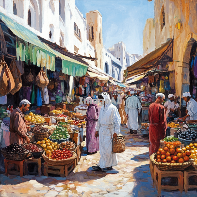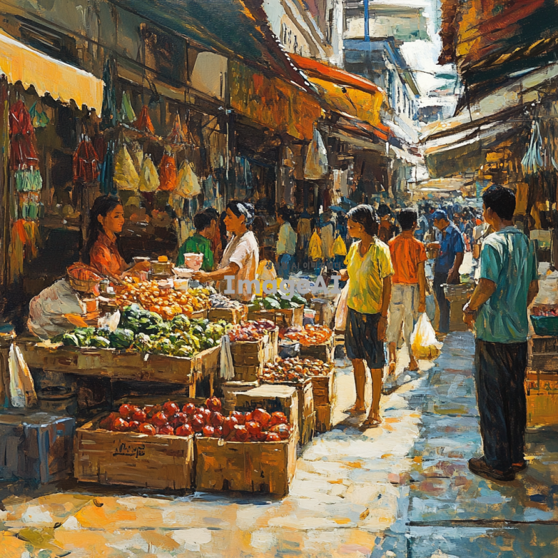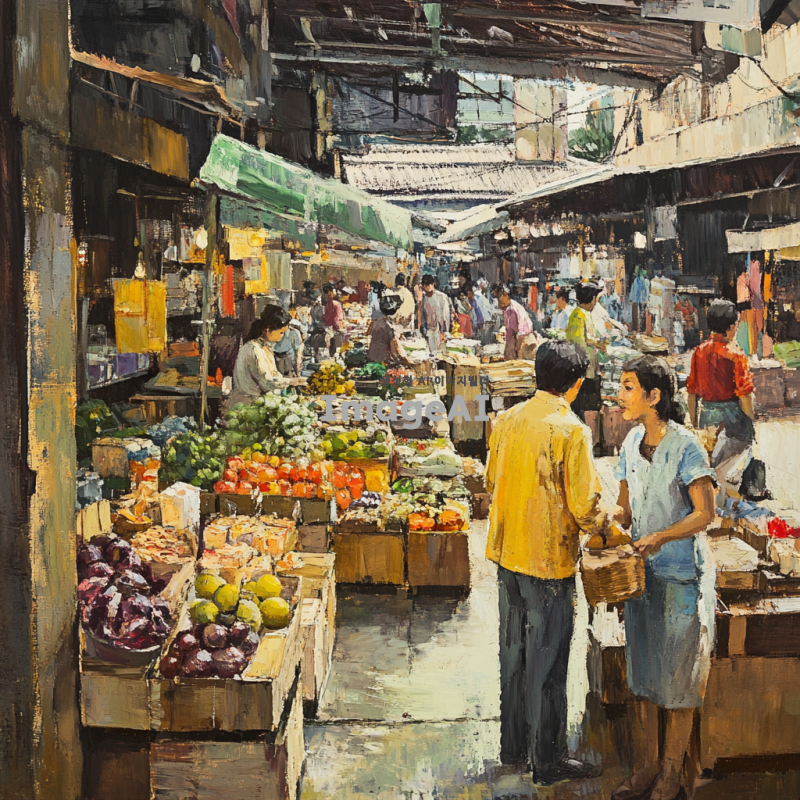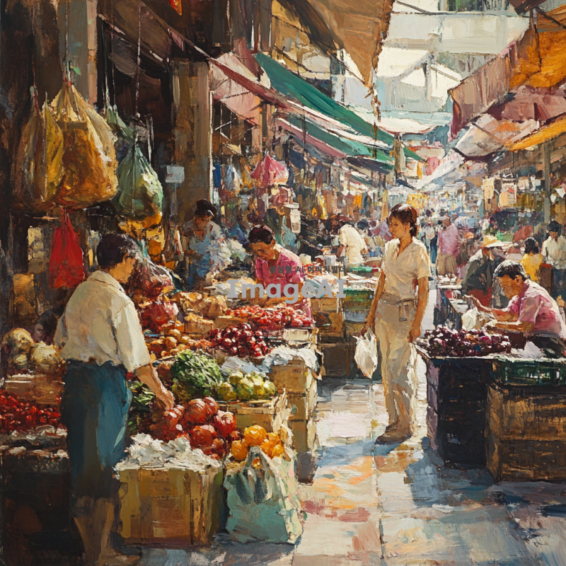 활기찬 시장 풍경, 다양한 연령대와 인종의 사람들이 물건을 사고 파는 모습, 각양각색의 상품들이 진열된 가판대, 서로 대화하는 상인과 고객, 시장 특유의 활기찬 분위기와 다채로운 색감, 전통적인 시장 건축물과 현대적인 요소가 조화를 이루는 배경.