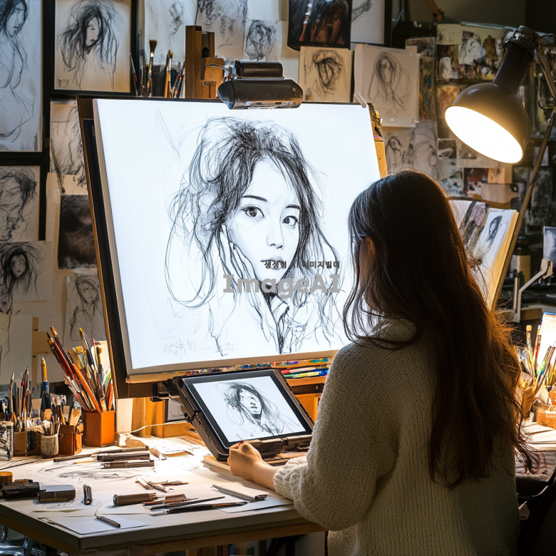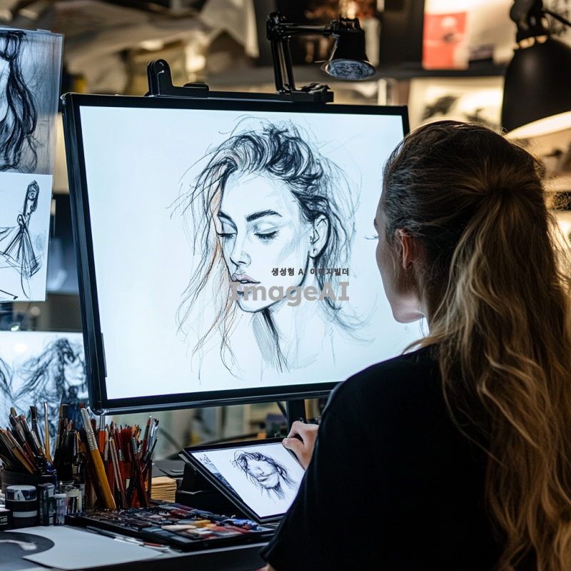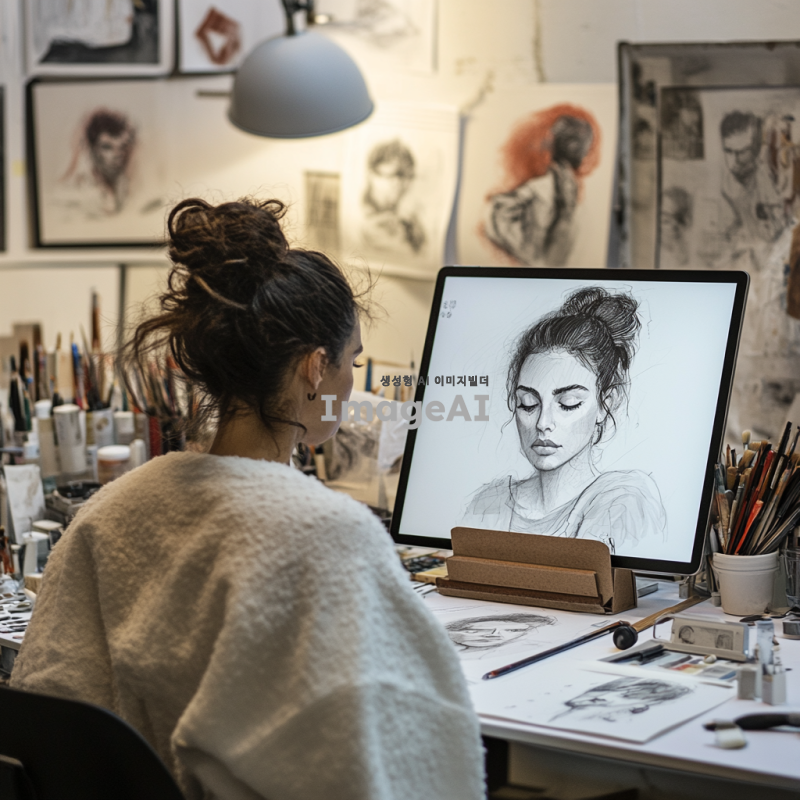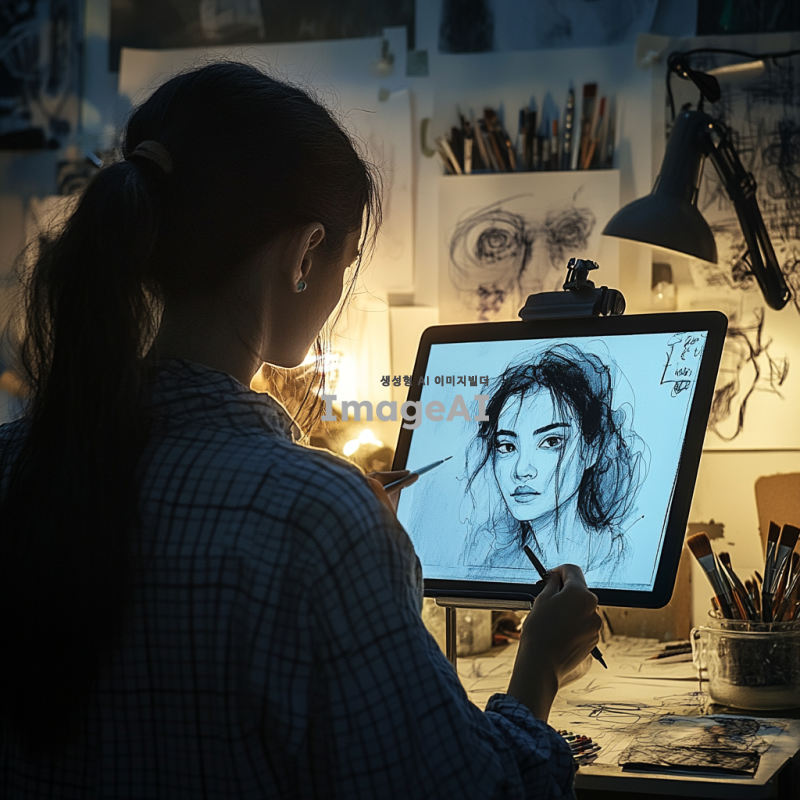 디지털 아트 스튜디오에서 타블렛을 사용하여 집중해서 인물 초상화를 그리고 있는 여성, 창의적인 분위기와 조명이 부드럽게 비추는 환경, 주변에 다양한 예술 도구와 스케치가 흩어져 있는 모습, 작업하고 있는 여성의 뒷모습, 현대적인 예술 작업 공간.