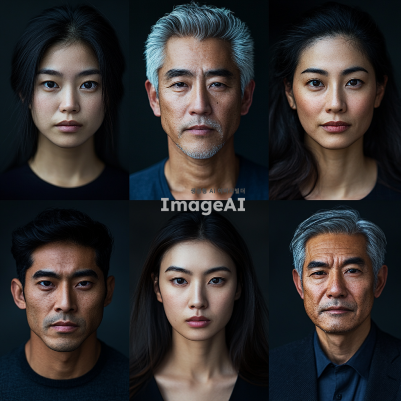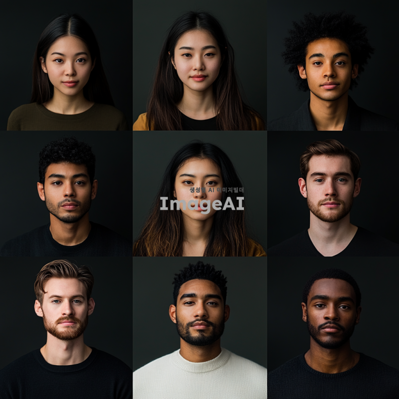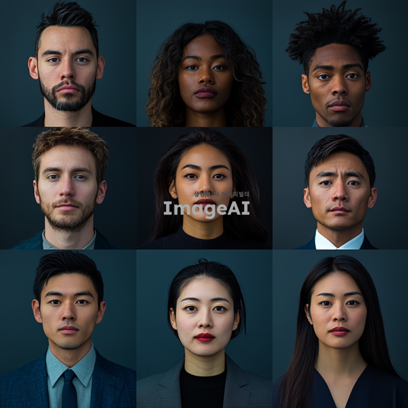 아시아인, 미국인등을 포함한 다양한 인종의 남성과 여성의 증명사진, 각각의 인물은 정면을 바라보고 있으며, 자연스러운 표정을 짓고 있음. 배경은 단색으로 깔끔하게 처리되어 있으며, 인물의 얼굴이 명확하게 드러나도록 조명은 부드럽고 균일하게 설정. 인물들은 각각 다른 인종적 특징을 반영하여, 아시아인, 아프리카계, 유럽계, 라틴계 등 다양한 인종을 대표. 각 인물은 포멀한 복장을 하고 있으며, 헤어스타일은 단정하게 정돈되어 있음.