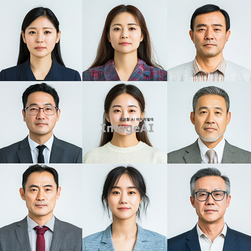 아시아인과 미국인등을 포함한 다양한 인종의 남녀 증명사진, 정면 얼굴, 자연스러운 표정, 깨끗한 배경, 다양한 피부 톤과 헤어 스타일, 전통적이거나 현대적인 의상, 조명 균일, 고해상도, 현실적이고 선명한 디테일, 성별과 연령대의 다양성 포함.