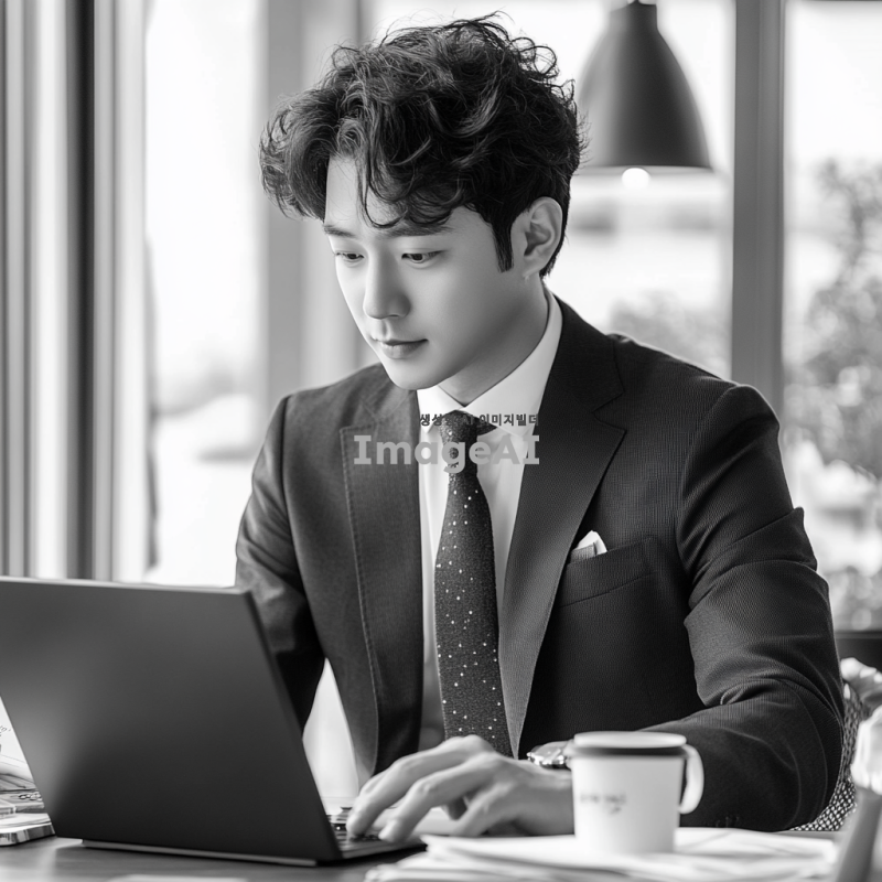 30대 한국인 남성 직장인, 깔끔한 정장 차림, 현대적인 사무실 배경, 노트북 앞에서 일하는 모습, 집중한 표정, 자연광이 들어오는 창문, 책상 위에 커피잔과 서류, 전문적이고 신뢰감 있는 분위기