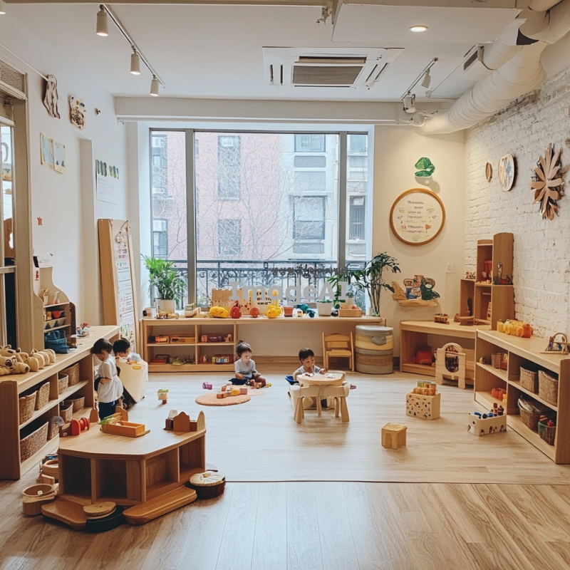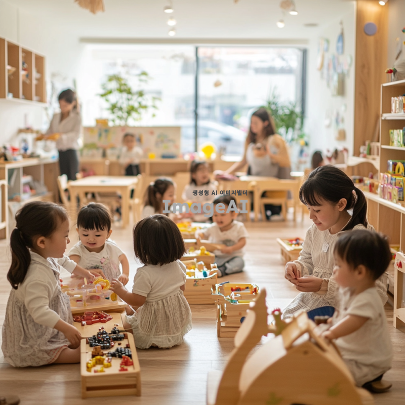 밝고 환영하는 분위기의 직장 내 어린이집, 다양한 인종의 아이들이 함께 놀고 있는 모습, 안전하고 깨끗한 환경, 친절한 교사들이 아이들과 상호작용하는 장면, 다채로운 장난감과 학습 도구가 구비된 공간, 자연광이 잘 들어오는 넓고 아늑한 실내, 아이들의 웃음소리가 들릴 것 같은 활기찬 분위기.