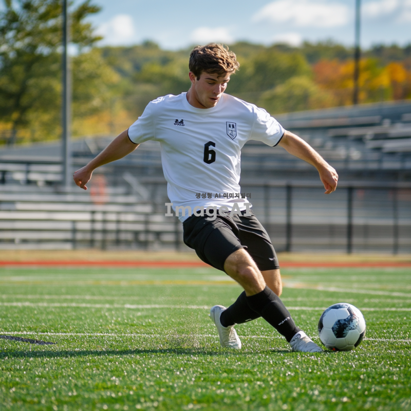 20대 초반 남성이 축구 경기장에서 축구공을 차는 역동적인 모습, 밝고 화창한 날씨, 잔디가 무성한 경기장, 남성은 운동복을 입고 있으며 집중한 표정, 배경에 희미하게 보이는 관중석