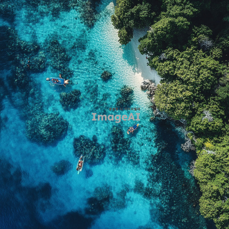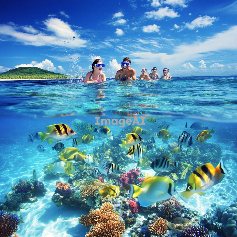 열대 바다의 맑고 푸른 물결 위에서 즐기는 호핑투어, 다양한 색상의 산호초와 열대어가 가득한 해양 생태계, 작은 보트에 탄 사람들이 스노클링 장비를 착용하고 물속을 탐험하는 모습, 햇살이 반짝이는 해변과 주변의 푸른 섬들, 여행자들이 즐거운 표정으로 물놀이를 즐기고 있는 장면, 따뜻한 기후와 여유로운 분위기, 자연의 아름다움이 돋보이는 풍경.