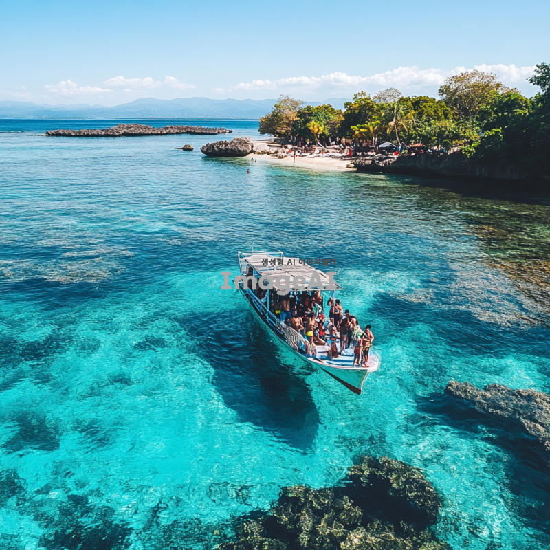 세부에서 호핑투어 즐기는 사진이 필요해. 방카보트도 나왔으면 좋겠어