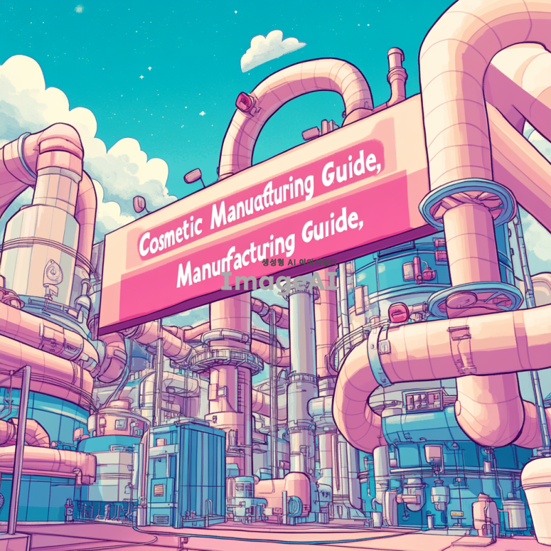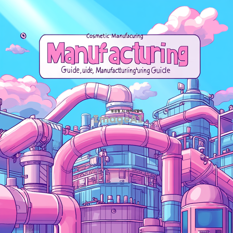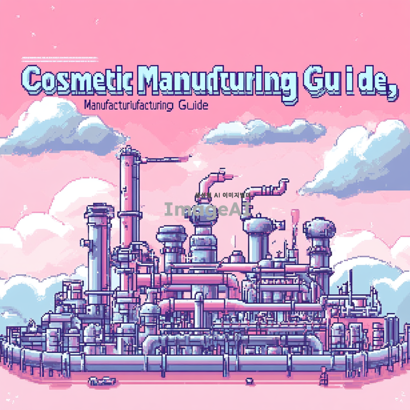 픽셀아트 스타일로 "화장품 제조 가이드"라는 제목을 중심으로 파이프 몇개 그려주고, 분홍색, 하늘색, 흰색을 섞어서 배경은 부드러운 파스텔 톤으로 설정해줘. "제조 가이드"라는 제목과 어울리게 설명서 제목처럼 그려줘.
