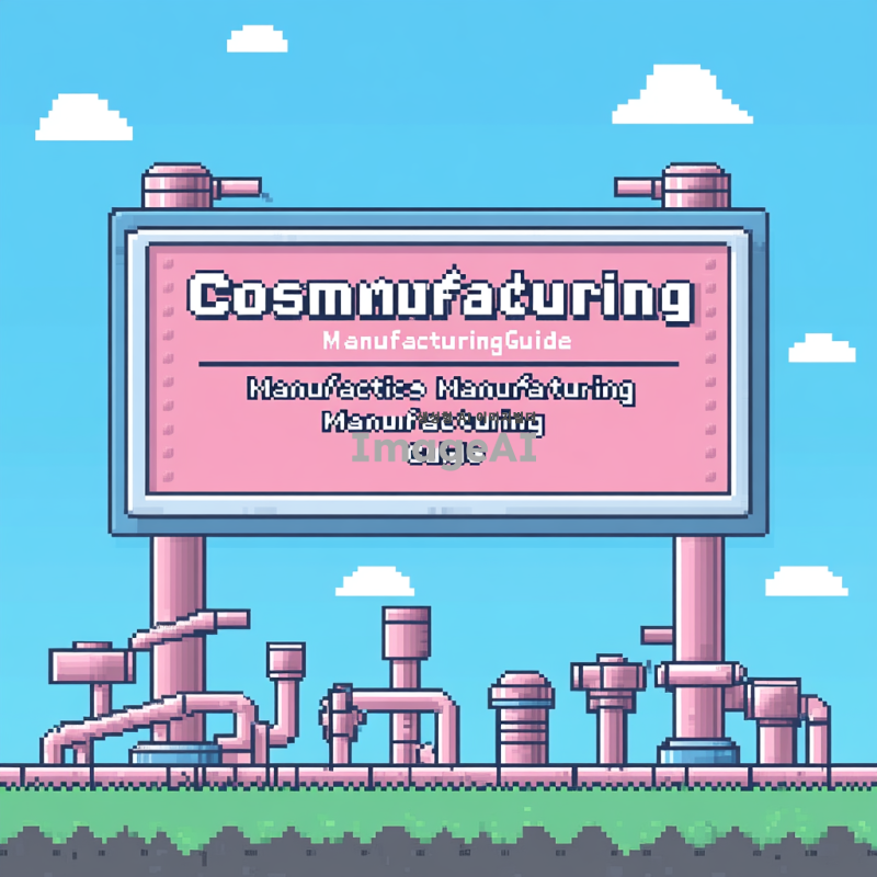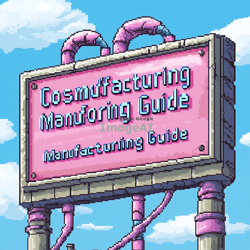 픽셀아트 스타일로 "화장품 제조 가이드"라는 제목을 디자인해줘. 배경 필요없이 간판만 디자인해줘. 간판디자인에 파이프 몇개 추가해주고 "화장품 제조 가이드" 라는 문장은 두줄로 배치해줘. 간판디자인 할 때 테두리가 있었으면 좋겠어.