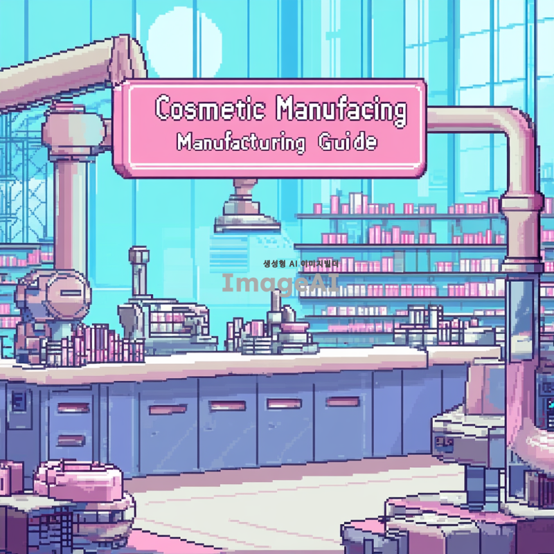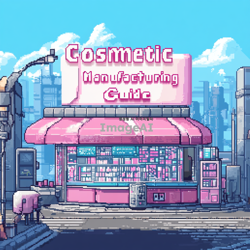 픽셀아트 스타일로 "화장품 제조 가이드" 타이틀을 디자인해줘. 게임 시작 화면 느낌으로, 분홍, 하늘, 흰색을 사용해줘.